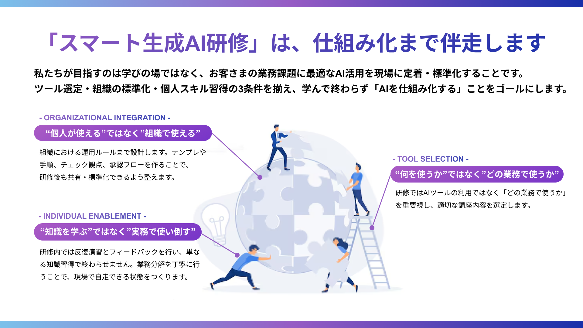 私たちが研修で最も大切にしているのは、受講者が研修を終えた瞬間から「自分の業務をこう変えよう」と動き出せる状態を作ること。研修を起点として、企業の業務変革を中長期で伴走してまいります。