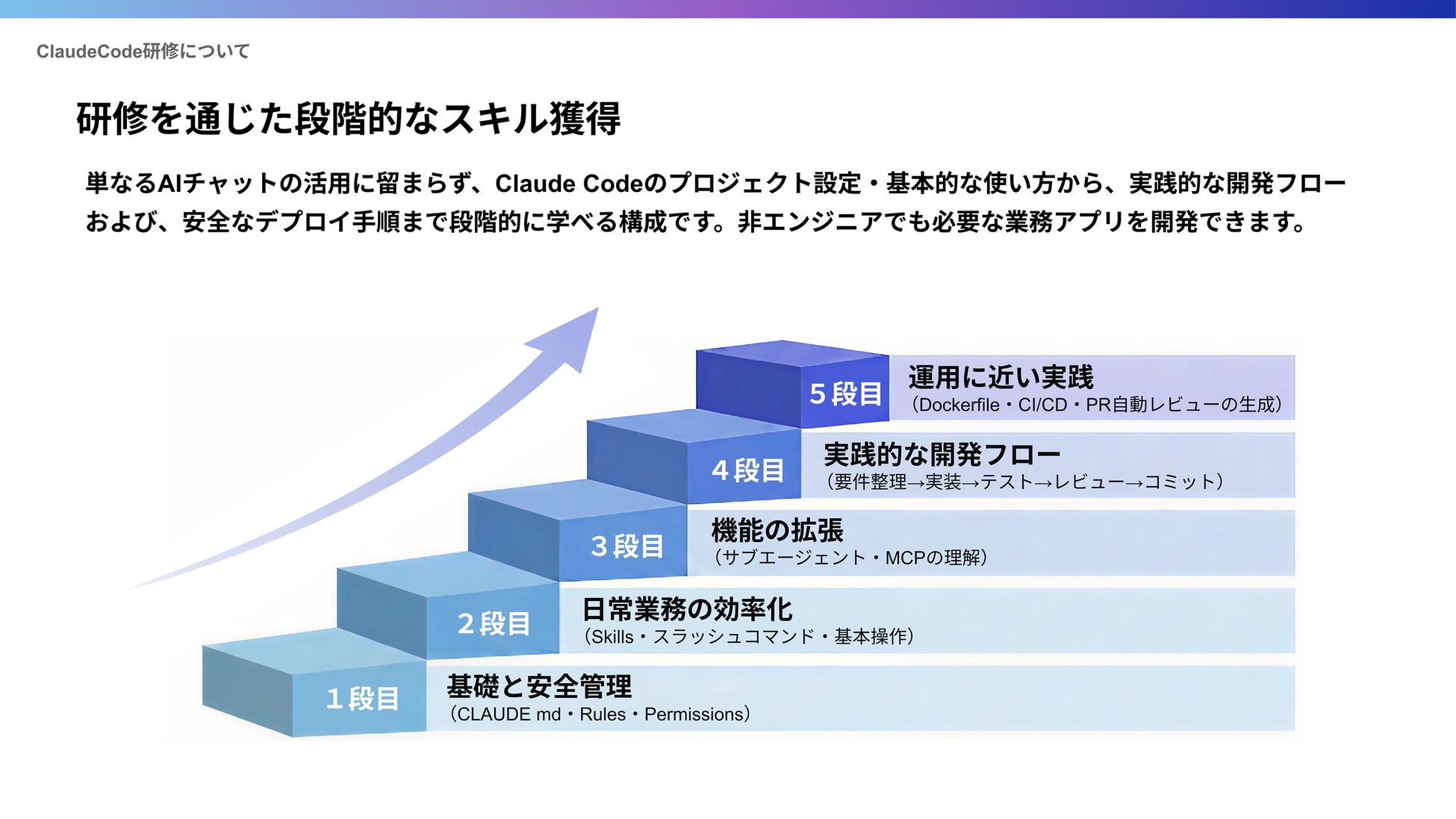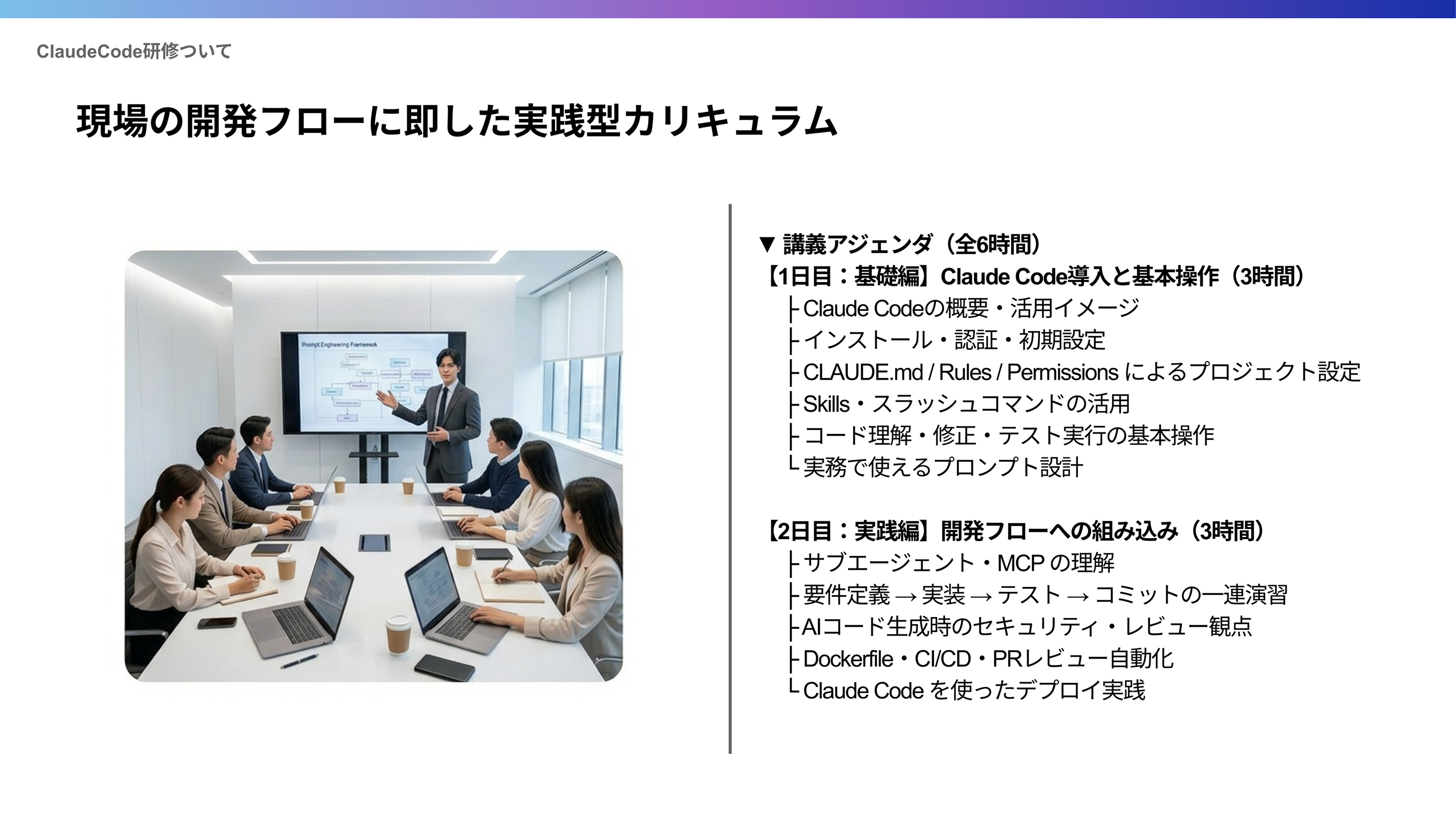 Day1とDay2の間に約2週間の実践期間を設定。習得した型を各自の実務に当てはめてClaude Codeを試し、研修期間中に業務改善の成果を生み出す構成