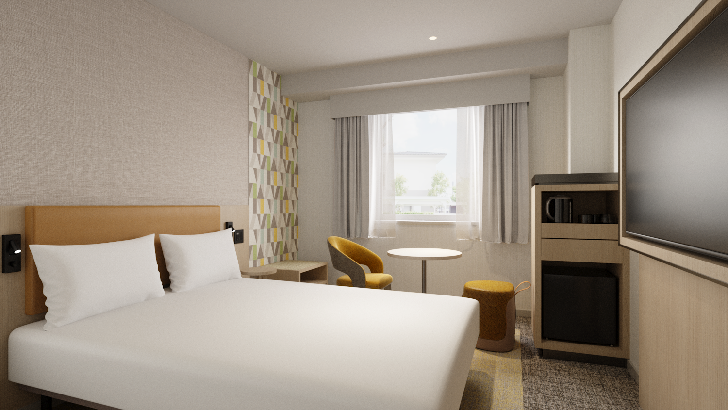 「ANAホリデイ・イン鳥栖」の客室は全126室。「ホリデイ・イン」ならではのデザインとサービスを取り入れ、快適性と洗練性を兼ね備えた空間へと刷新いたします。さらに、ブランドの象徴である「オープンロビー」コンセプトを導入し、ビジネスから観光まで、さまざまなシーンでご利用いただける、寛ぎと利便性を兼ね備えたホテルとして生まれ変わります。