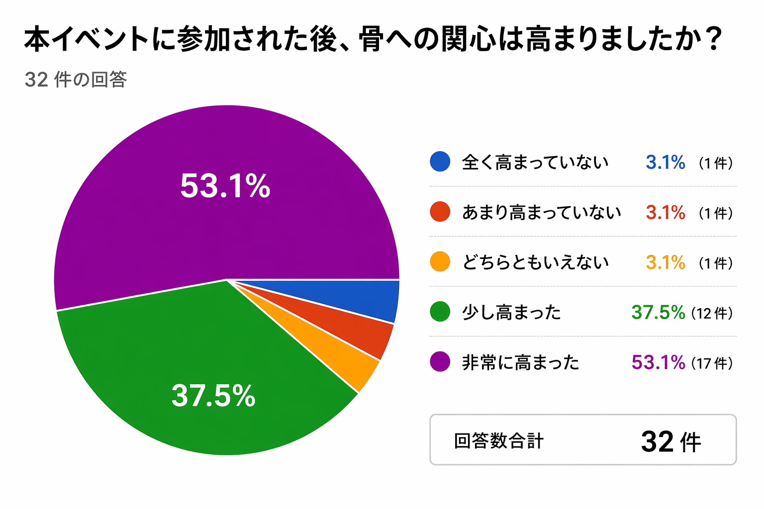また、体験プログラムを通じて、普段は気に掛けることが少ない骨の存在を感じながら、日常の中でも得られる変化を体験していただきました。