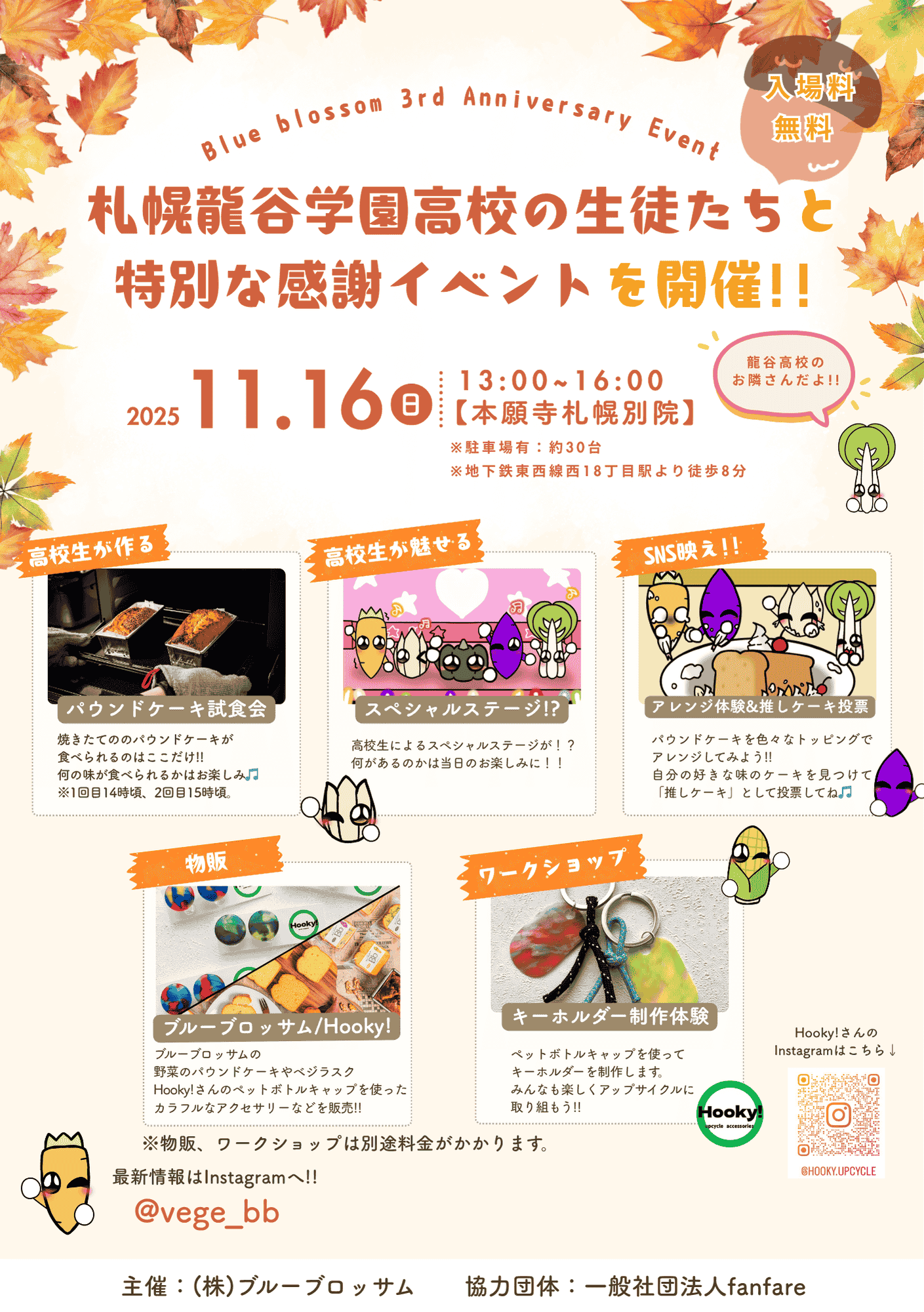 はじめまして。私は札幌市で、北海道産の規格外野菜を使った焼き菓子の製造・販売を行う「株式会社ブルーブロッサム」代表の工藤 勲と申します。当社では、見た目などの理由で流通できない野菜を活用し、食品ロスの削減と障がいのある方の就労支援を両立する活動を続けています。このたび、設立3周年を記念し、札幌龍谷学園高校の生徒たちと共同で企画した「ブルーブロッサム3周年記念 感謝イベント」を開催します。