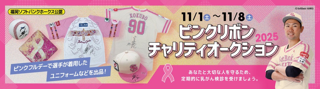 兵庫県尼崎市に拠点を置く出品代行サービス企業、神戸オークション株式会社(代表取締役:蓑代 雄一)は、2025年11月1日(土)11:00より、福岡ソフトバンクホークスと協働し「ピンクリボンチャリティオークション」を開催いたします。オークションは、11月8日(土)22:00ごろに終了予定です。