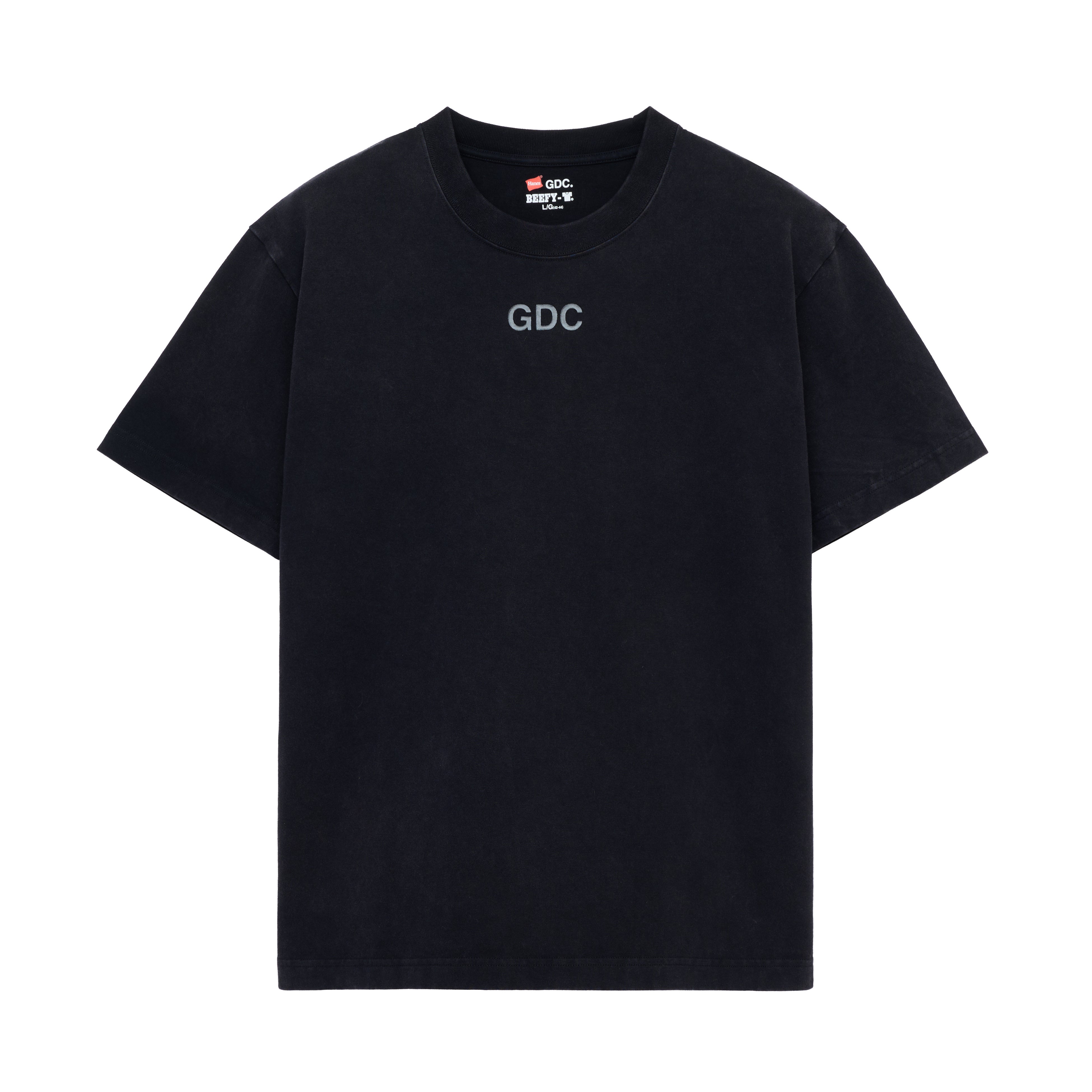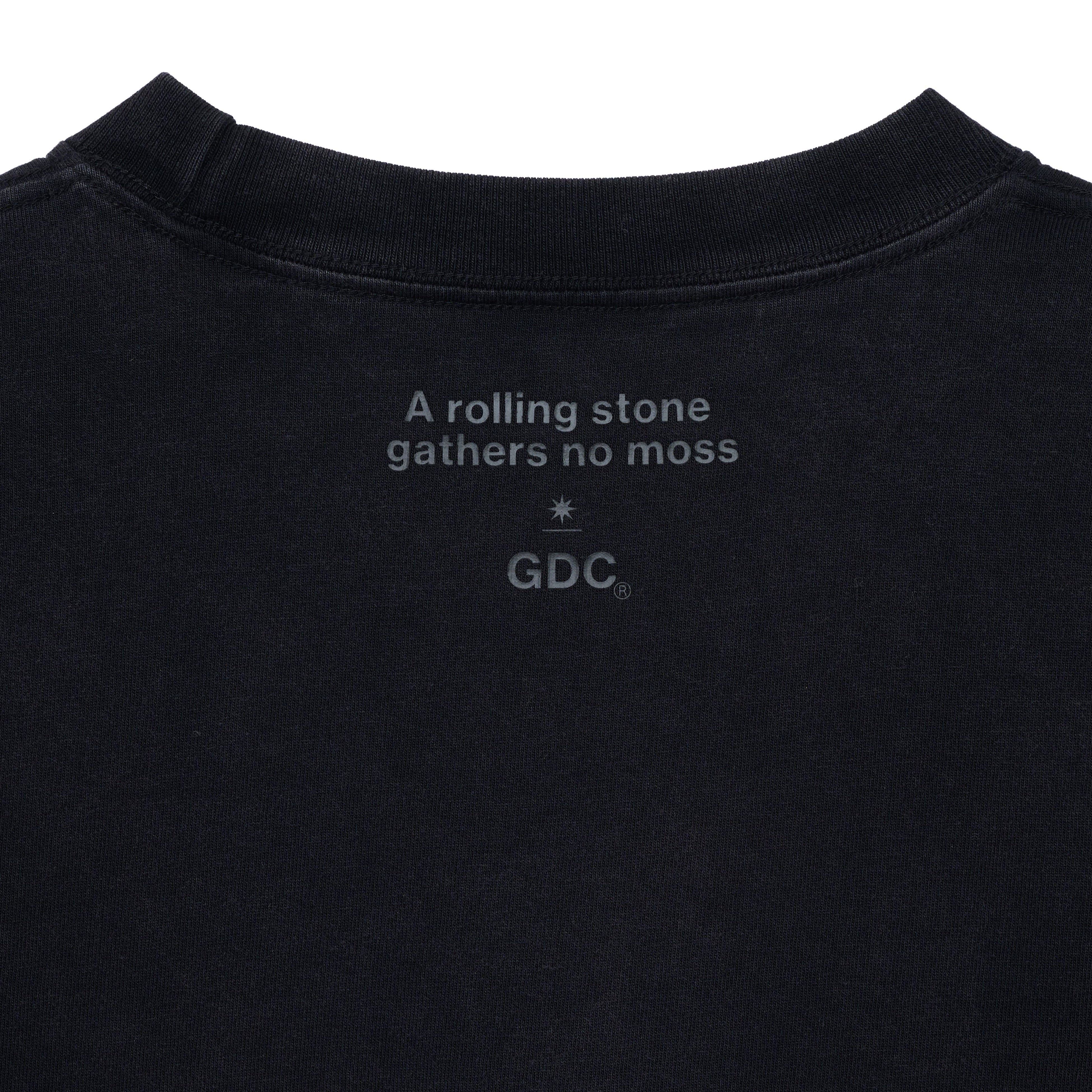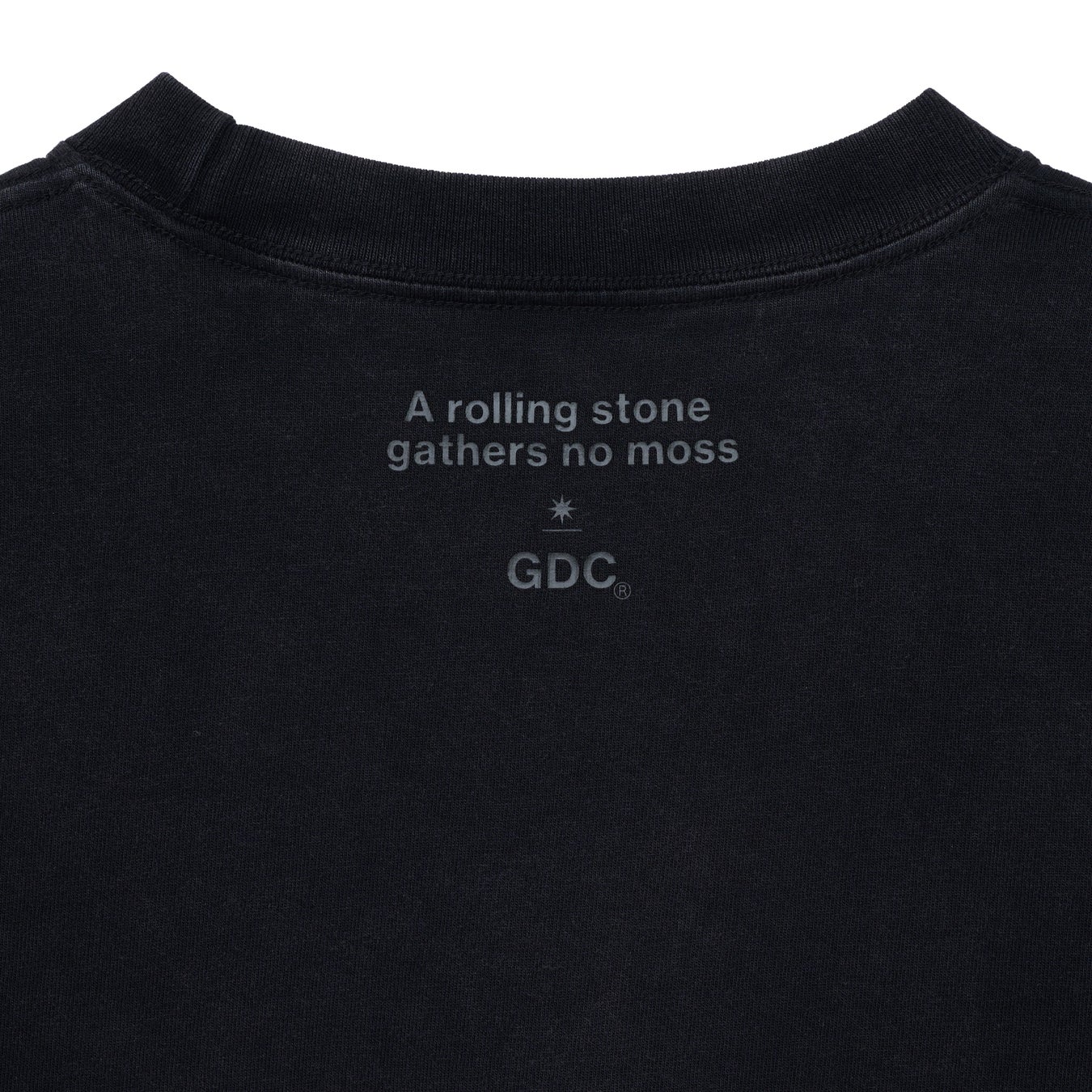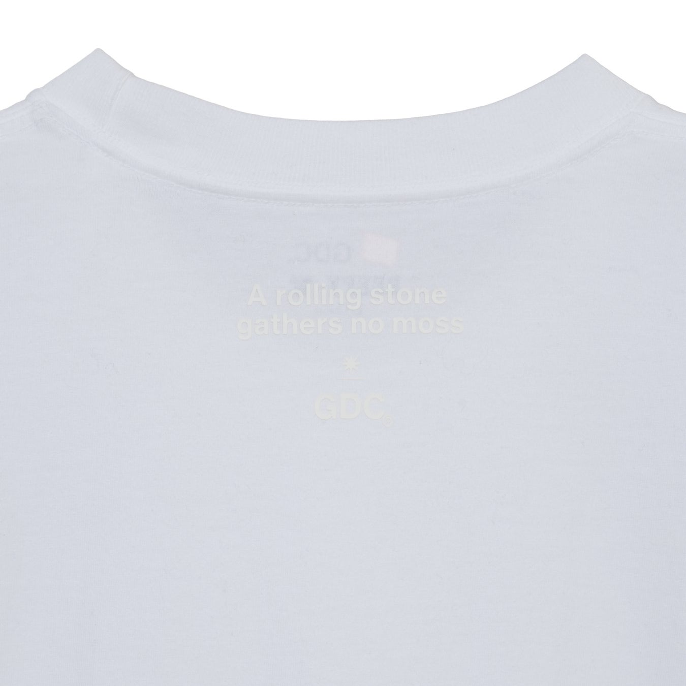 フロント胸元にはGDCロゴを配し、背面ネックポイントにはブランドの思想を象徴する“A rolling stone gathers no moss”のレターグラフィックをプリント。ミニマルな中にメッセージを込めたデザインとしています。