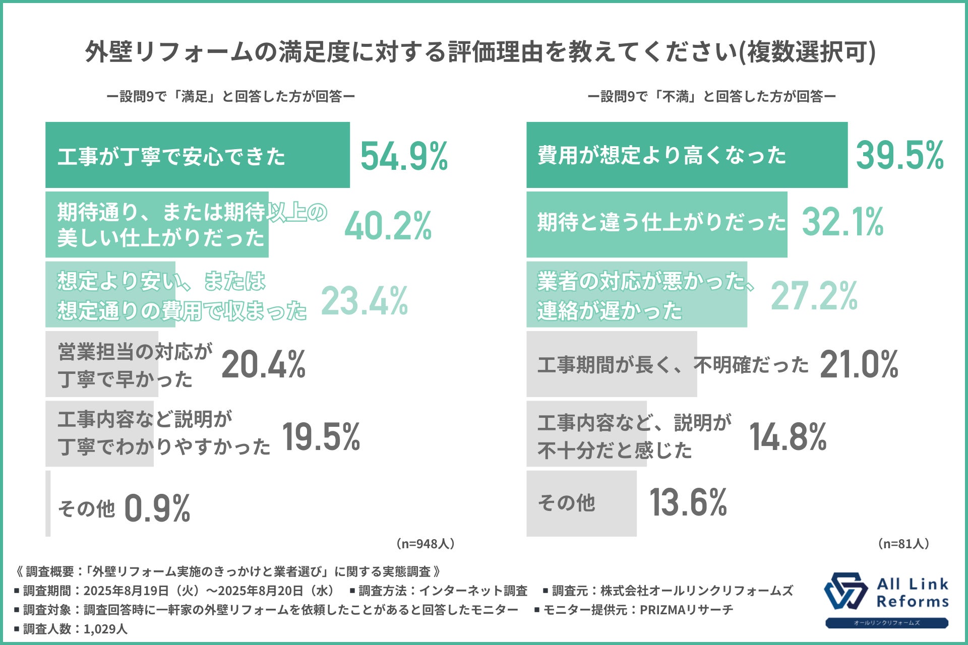 一方で、不満を感じた方の理由では「費用が想定より高くなった」「期待と違う仕上がり」「業者の対応が悪かった」といった点が目立ちました。