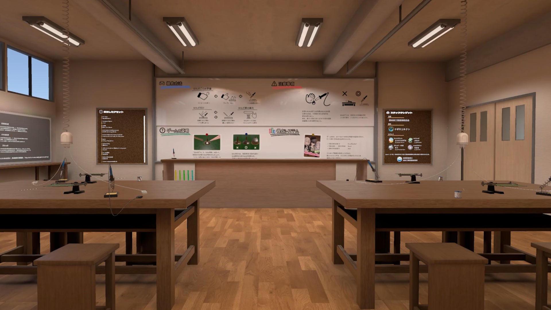 内装は学校の工作技術室をイメージしており、教室のような空間に2つの作業机が並んでいます。各机の上には、はんだごてと電子基板がセットされ、現実の実習風景をそのままメタバースに持ち込んだような空間になっています。ワールドは以下の通り。