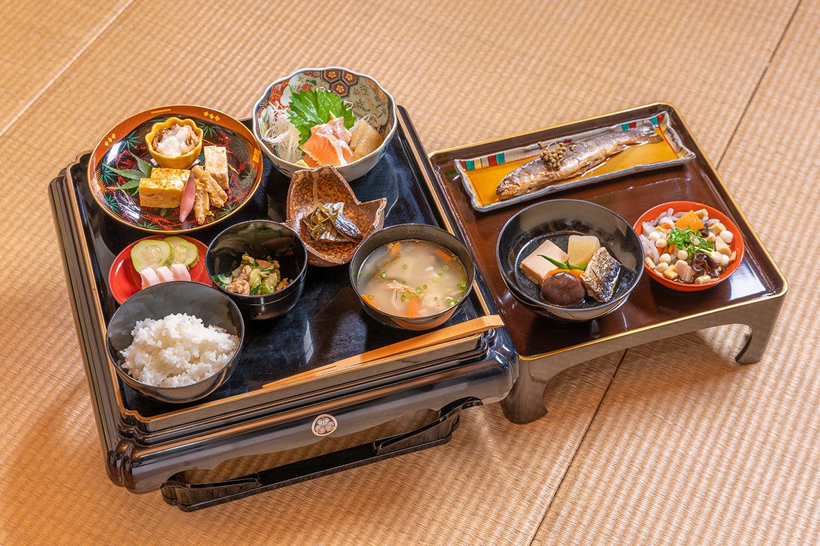 会津の歴代藩主たちが愛した別荘地「御薬園」では、ガイドとともに庭園を散策の後、本ツアーのために仕立てられた「武家料理」を、庭園の中にある御茶屋御殿で楽しめます。料理は、会津居酒屋「籠太」鈴木料理長が会津武家料理を歴史書等を参考に再現したものです。また、食事終了後には御薬園自慢の抹茶セットも味わえます。紅葉に色づく美しい庭園を眺めながら過ごす特別な時間です。