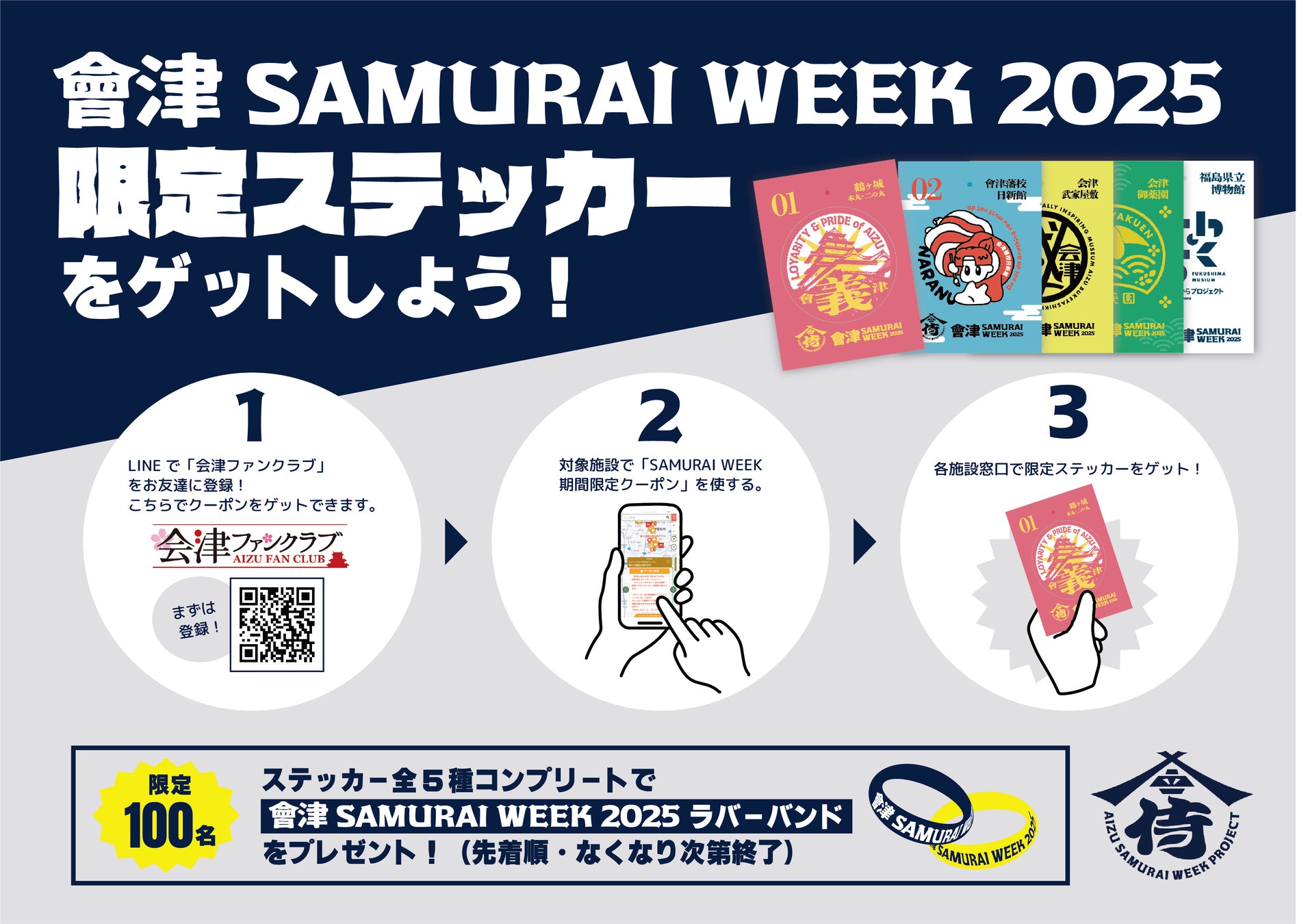 LINEのお友達登録で会津エリアの観光施設で使えるクーポンがもらえる「会津ファンクラブ」。イベント期間中は、「SAMURAI WEEK 期間限定クーポン」が出現。対象施設で本クーポン使用により、限定ステッカーをプレゼントします。さらに、全5施設のステッカーをコンプリートすると、オリジナルラバーバンドももらえます。