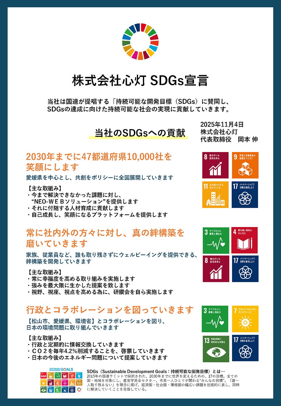 株式会社心灯(本社:愛媛県松山市、代表取締役:岡本伸)は、持続可能な社会の実現と企業価値向上を両立させるため、SDGs大学 副理事長である花野雅彦様をお呼びして、全従業員を対象としたSDGs研修を完了し、この度「SDGs宣言書」を策定・公表いたしました。