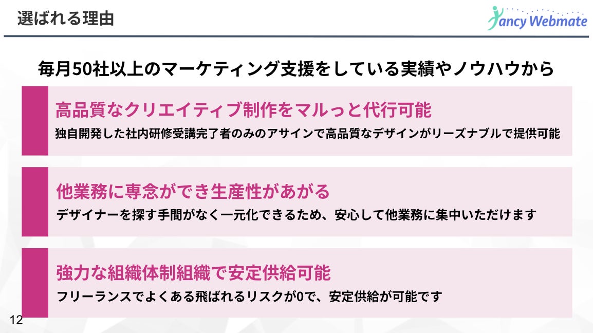 SNSマーケティング事業を展開するFancyWebmate株式会社(本社:東京都渋谷区、代表取締役:中上雄翔)が提供する、月額定額制のデザイン制作サービス「デザインプロ」の導入企業が急増しています。