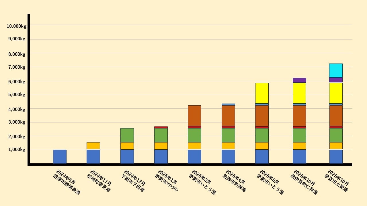2024年6月、沼津市の静浦漁港から始まった本プロジェクトは、約1年半で着実な成果を上げています。松崎町で500kg、下田市で1トン以上、伊東市では2回の活動で計3トン・・・と、累計7トン以上の海洋ゴミを回収しました。特に2025年3月の伊東漁港では、プロダイバー11名、陸上ボランティア80名、海上保安庁・陸上自衛隊・海上自衛隊が協力する大規模清掃を実現。