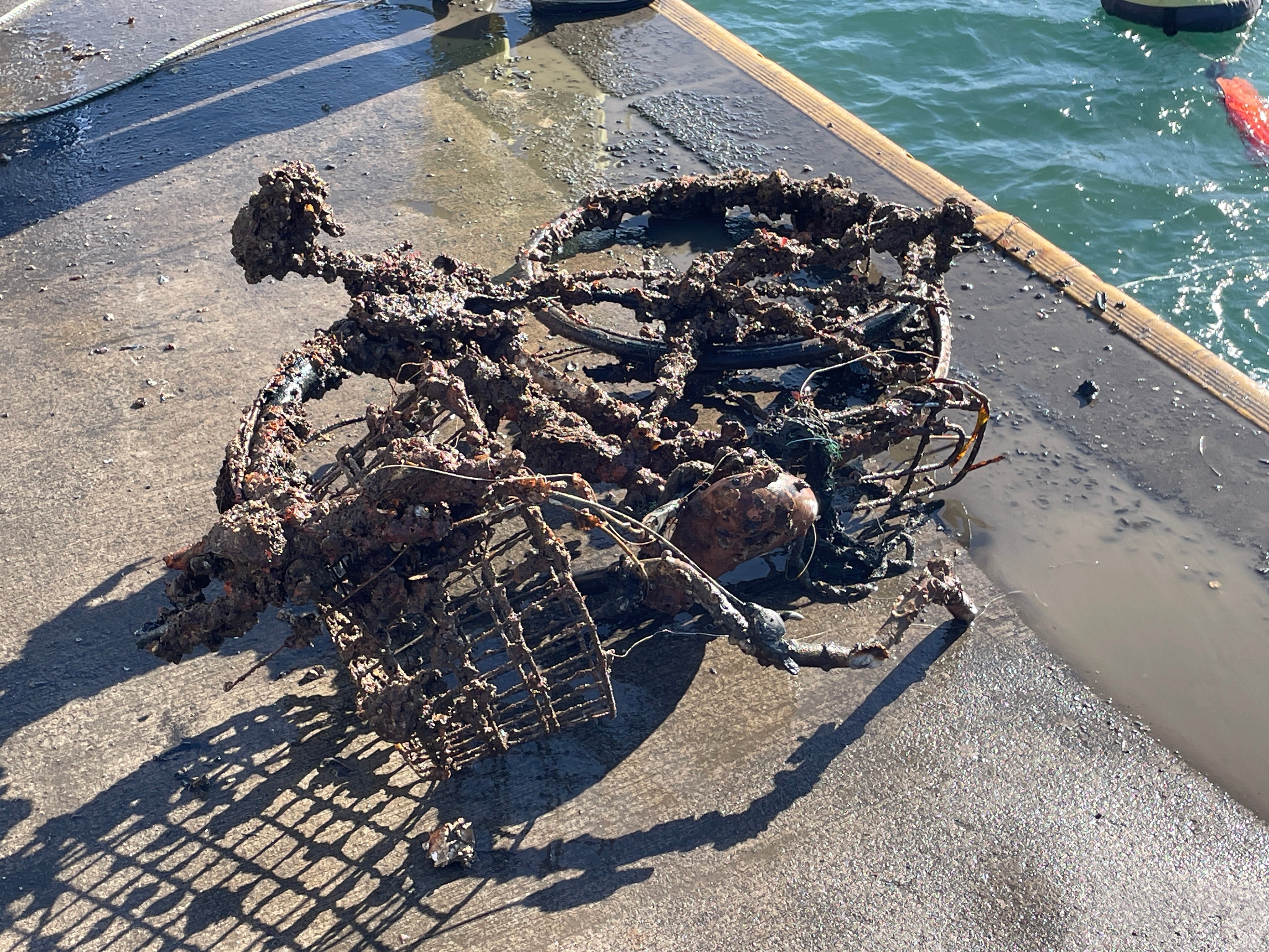 水中では、プロダイバー3〜4名が1チームを編成。ダイバーのチーム内で水中担当と水面担当に分かれ、陸と連携しながら作業を進めます。視界がほとんど効かない、ヘドロが堆積した海底で、手探りでゴミを回収。時には、数十キロもある大型ゴミ(便器 、バッテリー、タイヤ、自転車、バイク、BBQコンロなど )を、リフトバッグやロープ、カラビナ、クランプ、フォークリフトなどの道具や重機を使用しながら引き上げる作業も行います。