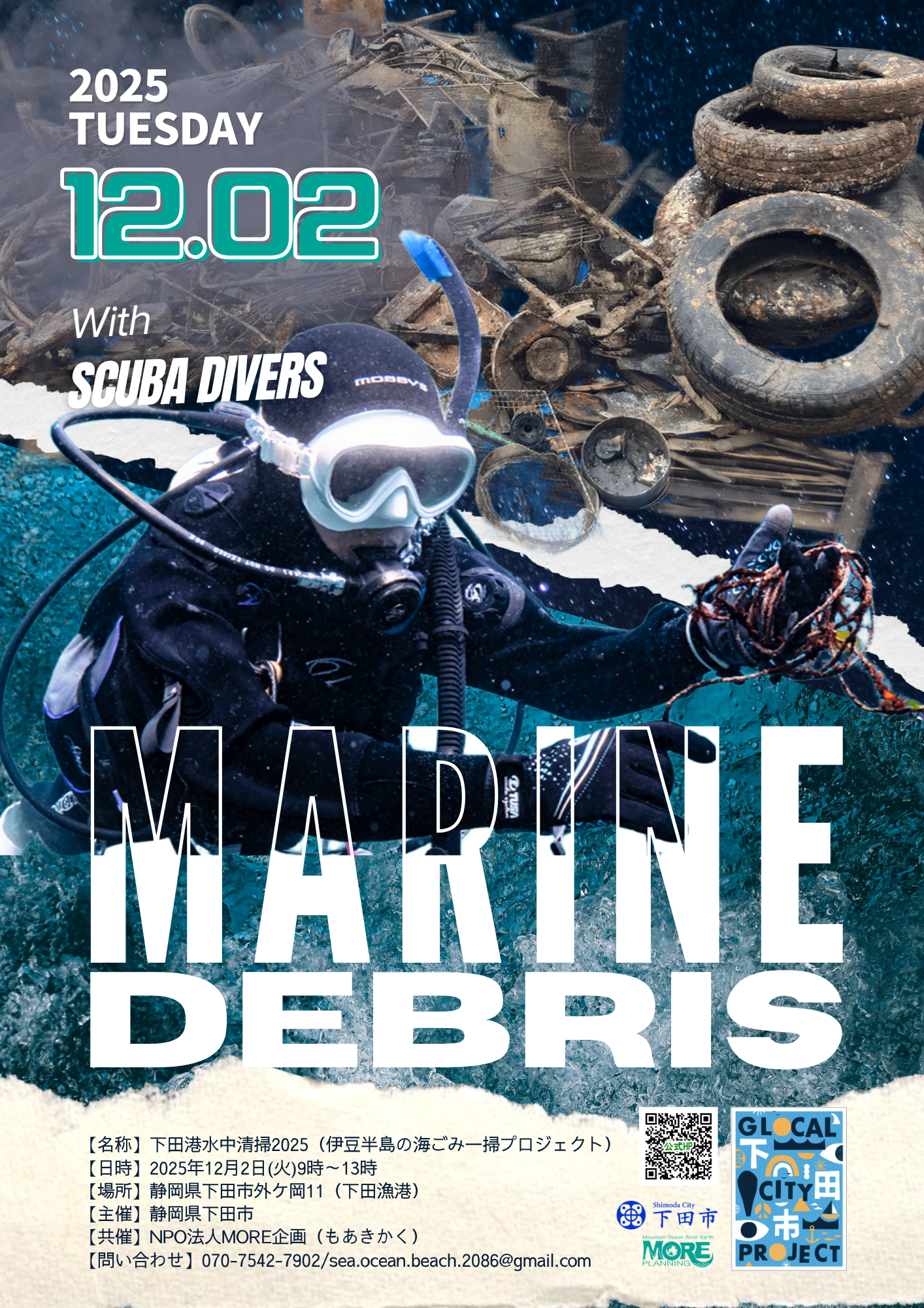 NPO法人MORE企画(代表:白井ゆみ、所在地:静岡県伊東市/伊豆市)は、伊豆半島の美しい海を守る「伊豆半島の海ゴミー掃プロジェクト」を12月2日(火)に下田市で実施いたします。(当港では2回目の開催)