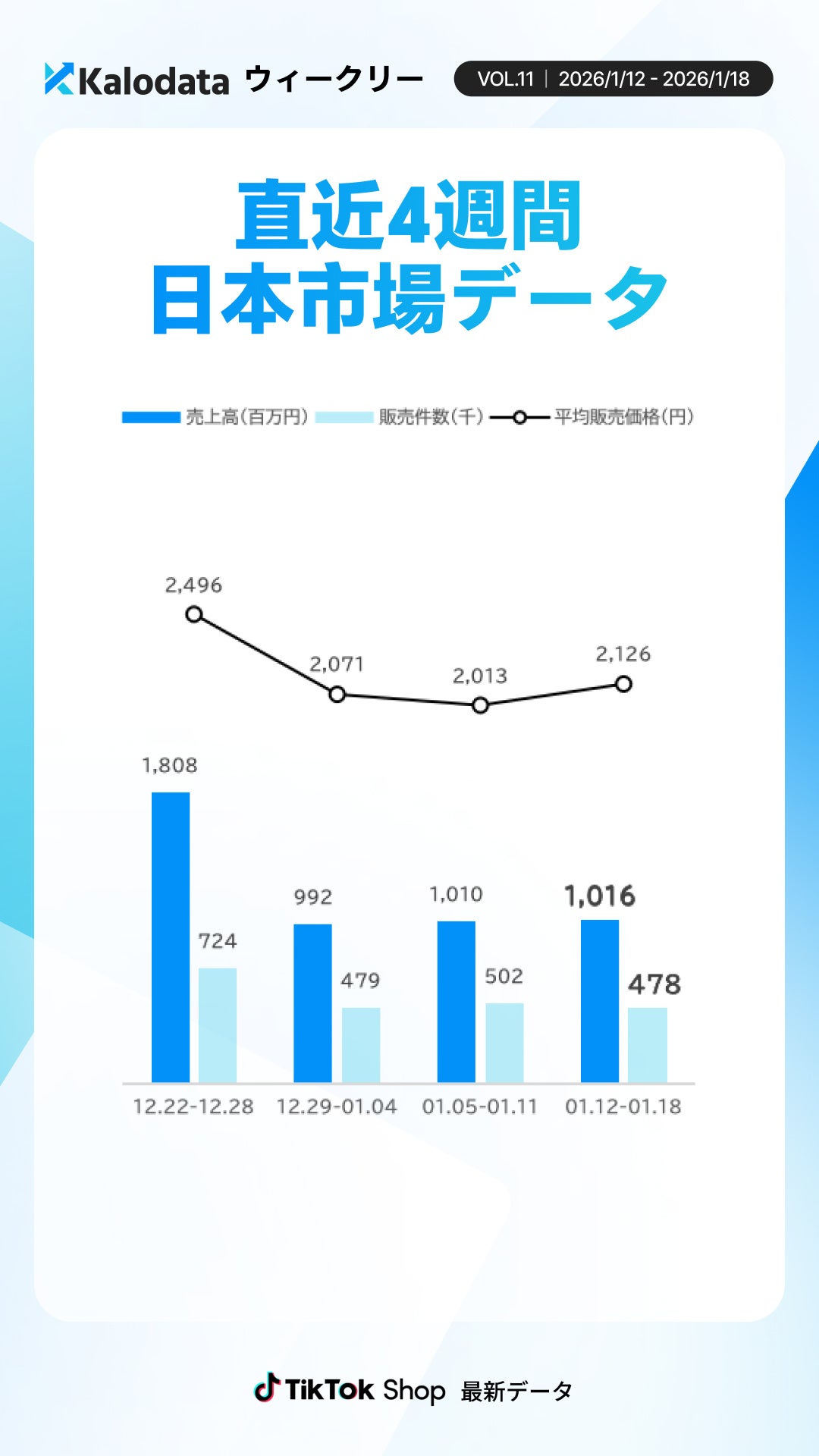 1月12日〜1月18日の日本TikTok Shopは、GMV10.2億円(前週比+0.6%)と横ばいで推移しました。