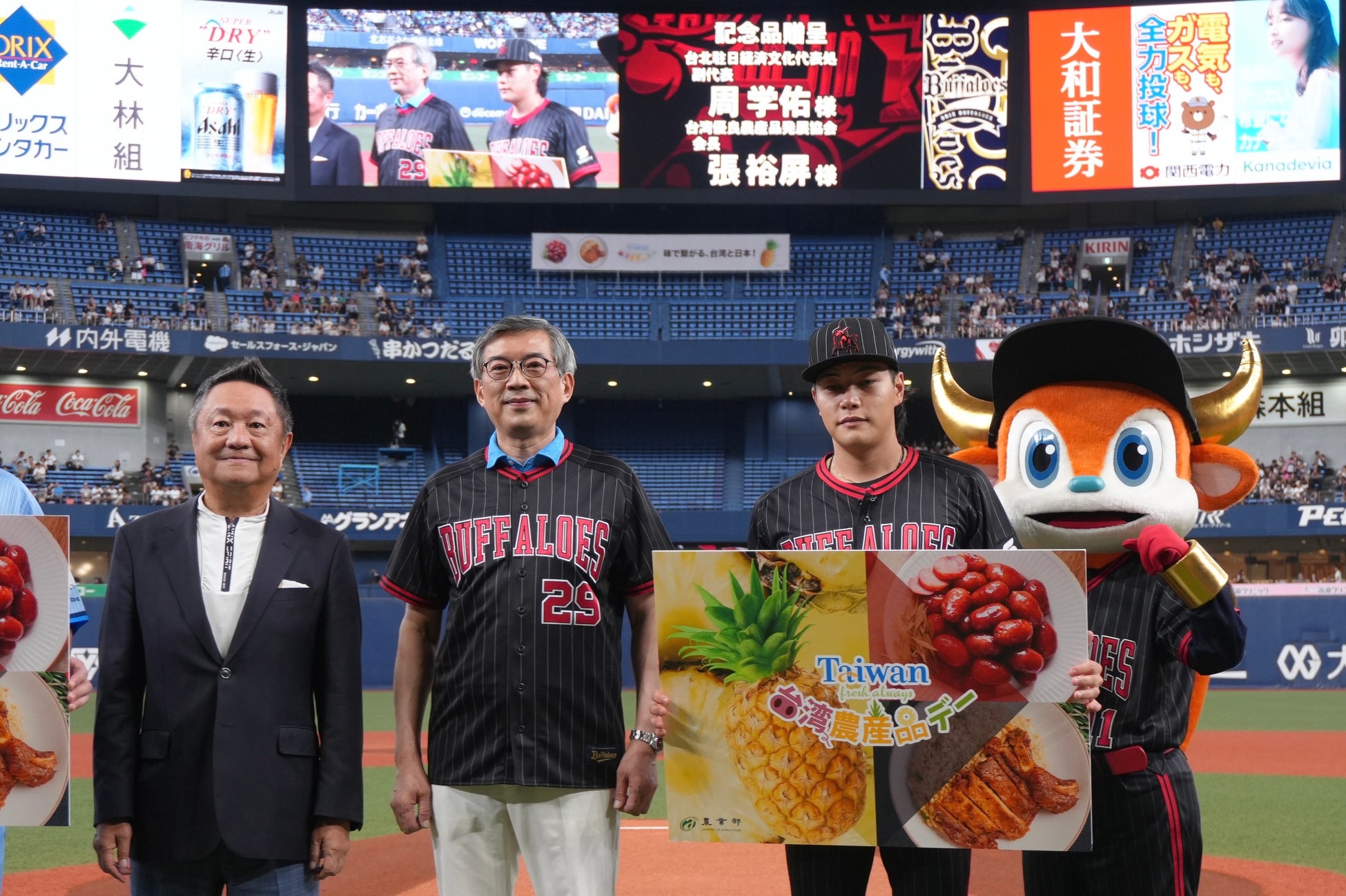 昨日(15日)京セラドーム大阪で行われたプロ野球オリックス・バファローズ対埼玉西武ライオンズ戦において台湾農業部がゲームスポンサーとなり「台湾農産品デー」を盛大に開催しました。台北駐日経済文化代表処の周学佑副代表が始球式ゲストとして登場し、球団に台湾産パイナップルや台湾ソーセージなどの豚肉加工品を贈呈。来場した3万人を超える観客に、台湾の魅力あふれる農産品を熱烈にアピールしました。
