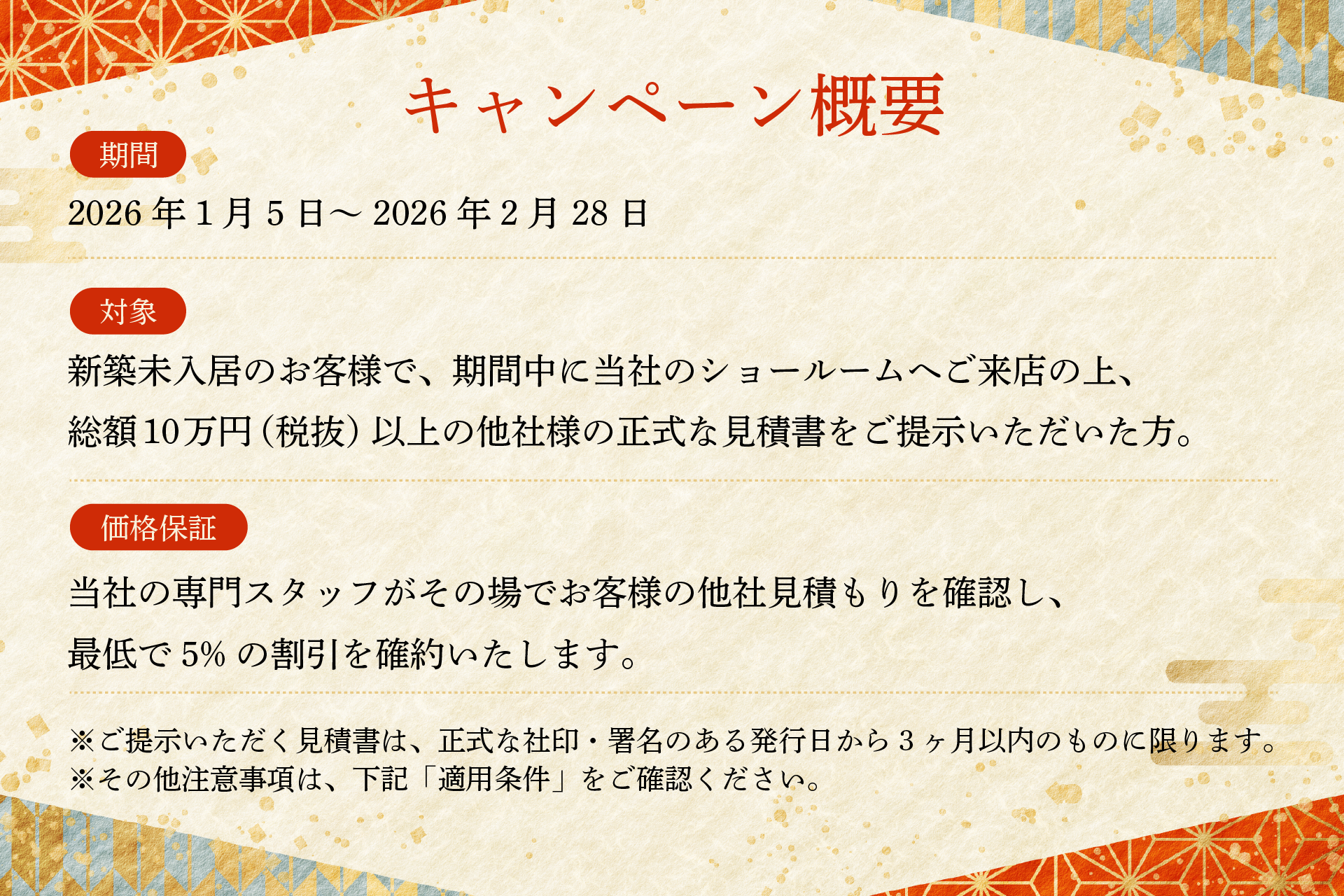年始のこの時期は、多くの方が住宅に関する情報収集を始める絶好の機会です。「フロアコーティングの費用がいくらになるか」という初期の不安を解消し、お客様が安心して一歩を踏み出せるよう、価格の透明性と確実なお得感を提供する本キャンペーンを実施します。