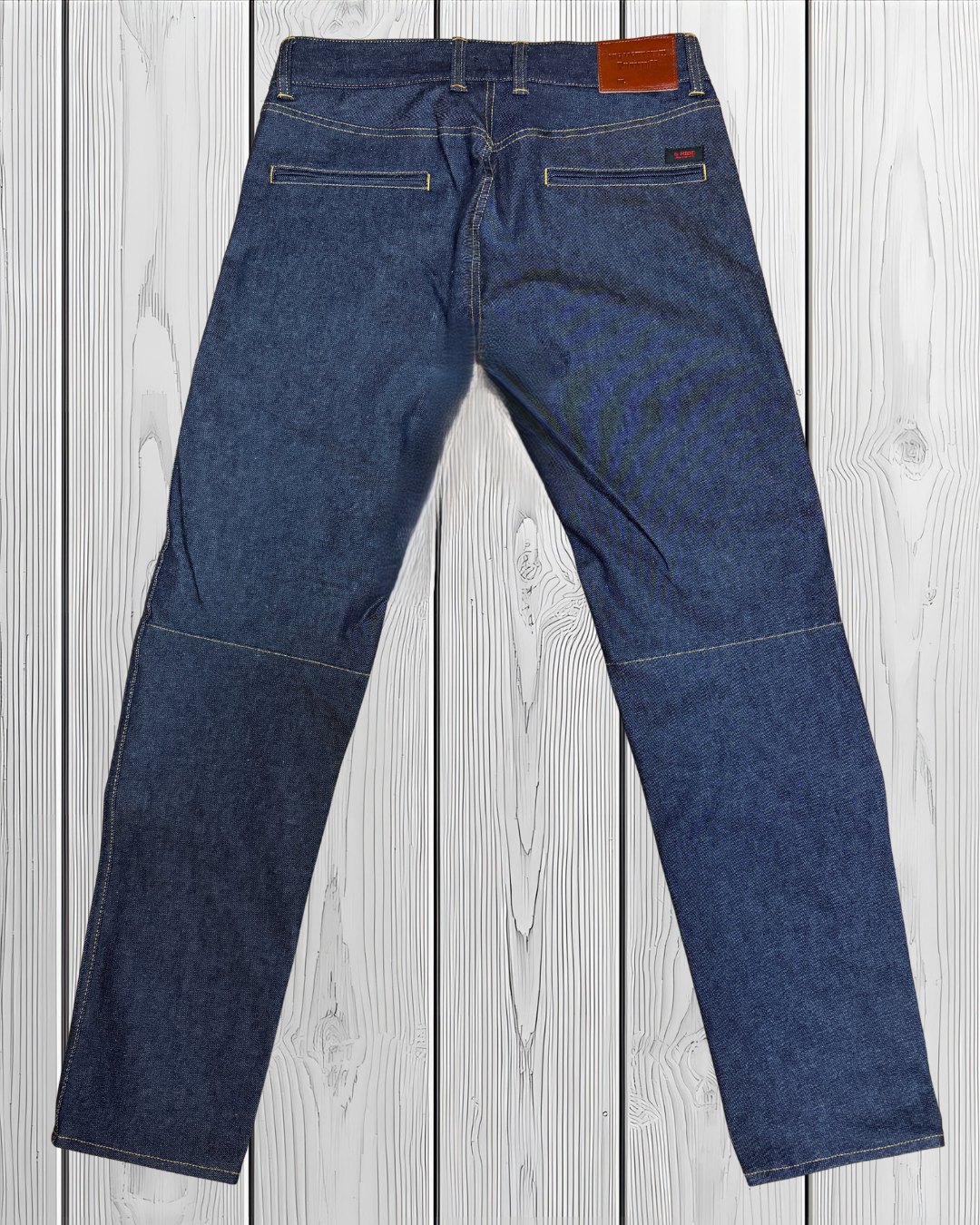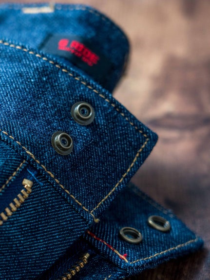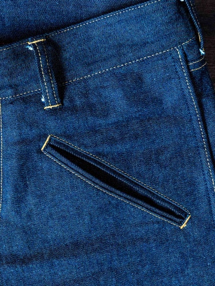 岡山産デニム(12oz、2%スパンデックス)を、かつてデニムで栄えた秋田県、宮城県で職人が1本ずつ縫製。純国産。