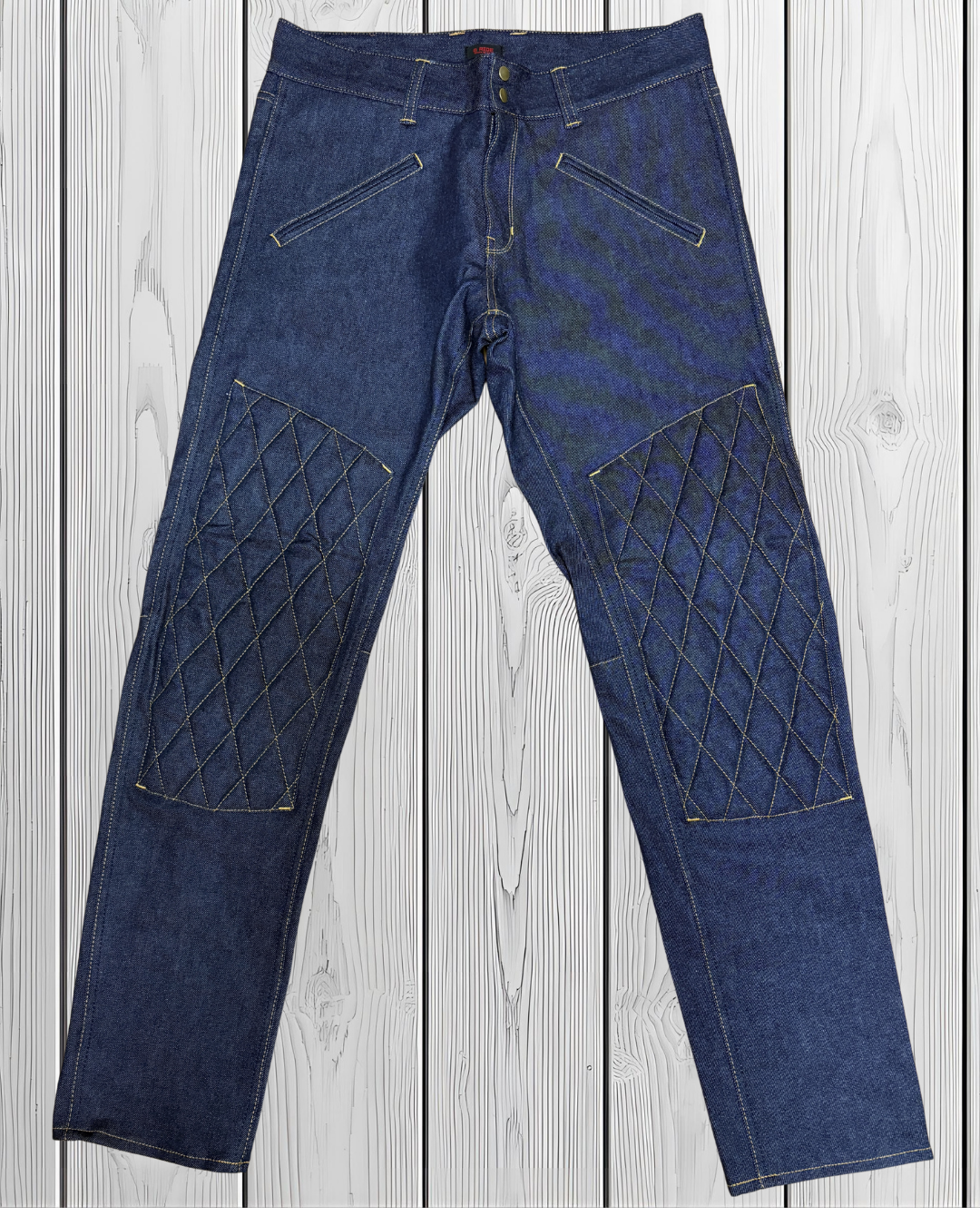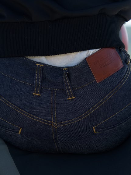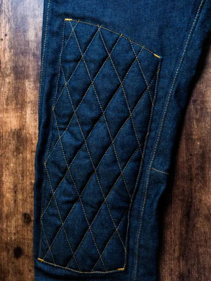 特徴的なダイヤ柄は10mm厚ウレタン+別布+デニム構造で柔軟かつ保護性能を両立しています。