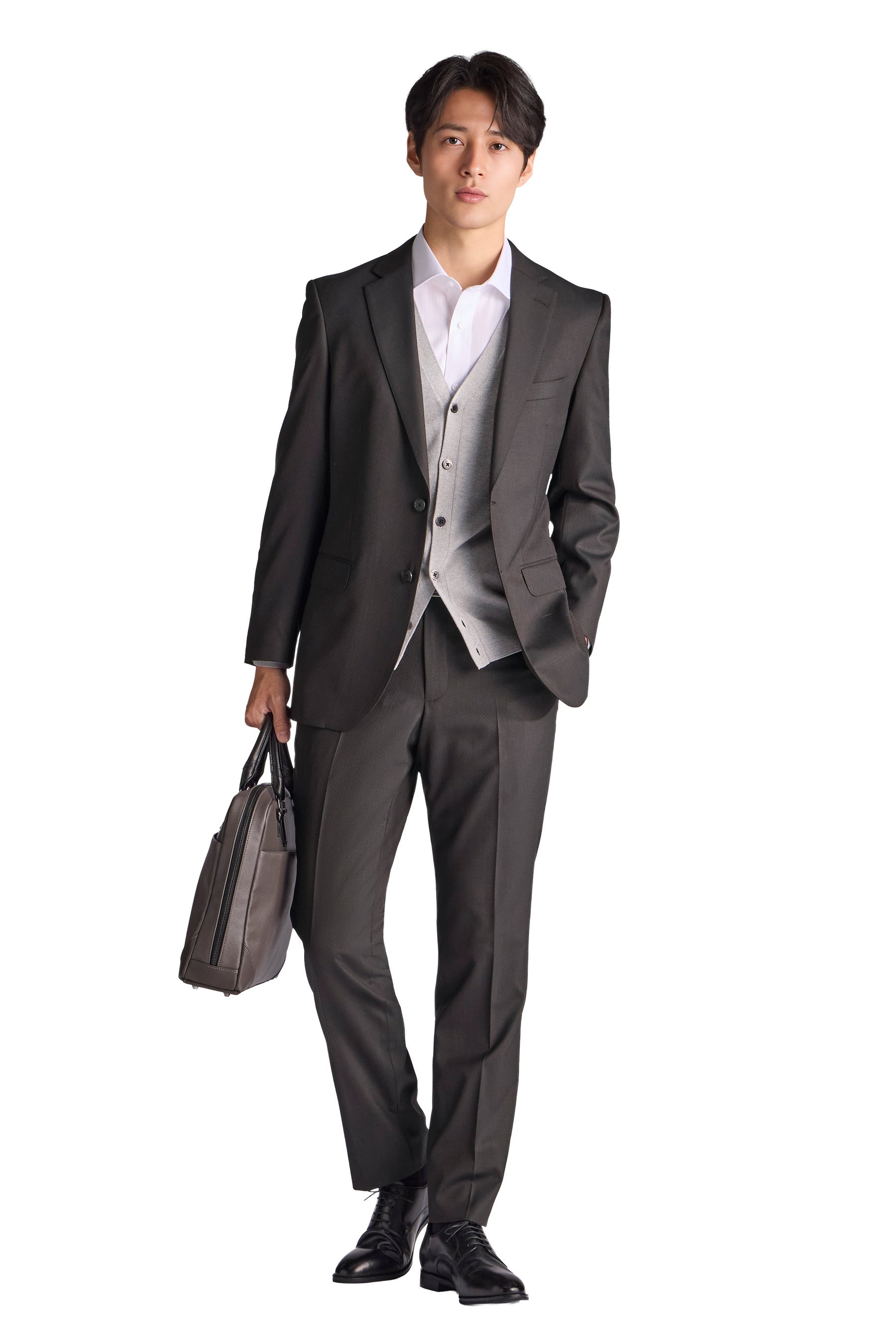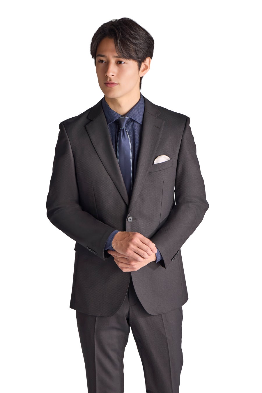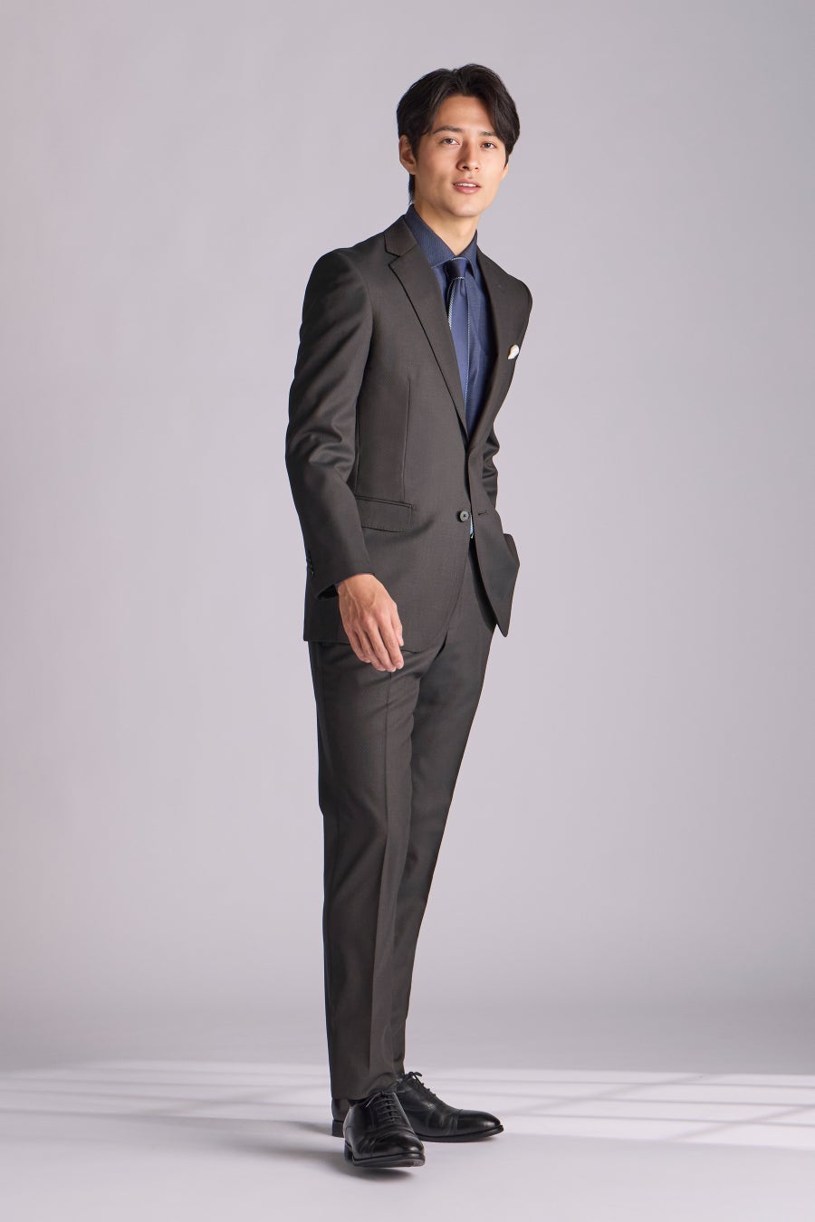 深みのあるこげ茶が、上品さと余裕を演出。すっきりとしたシルエットがスタイルを美しく見せ、日常の装いから社内行事などの節目まで、オン・オフ問わず活躍。ノータイにカーディガンを合わせた、今どきの軽やかな大人スタイルは、堅くなりすぎず好印象を与えます。