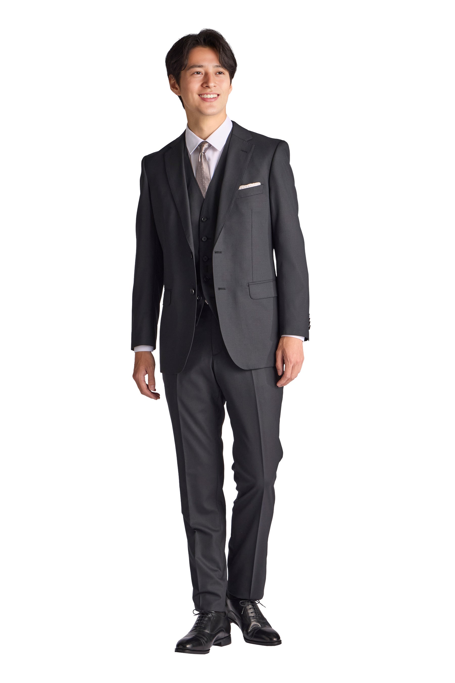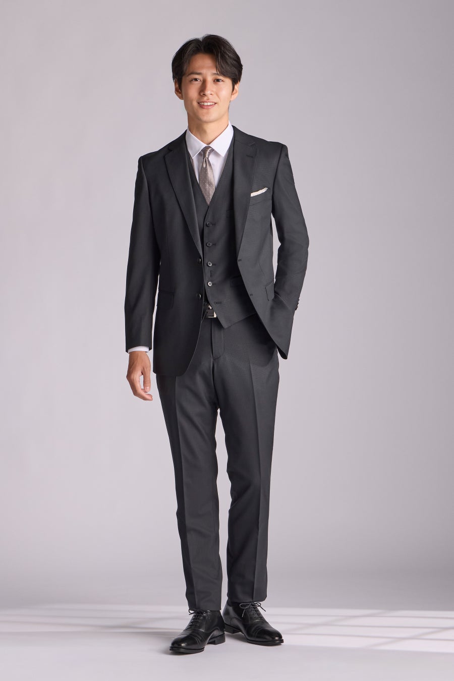 端正な佇まいが際立つ3ピース仕様で、装いに格調と安心感をもたらす一着。式典やフォーマルな場はもちろん、装いを整えたいビジネスシーンにも自然に馴染みます。ベストを外せば表情が変わり、シーンに応じた着こなしが楽しめる、長く頼れる定番スーツです。