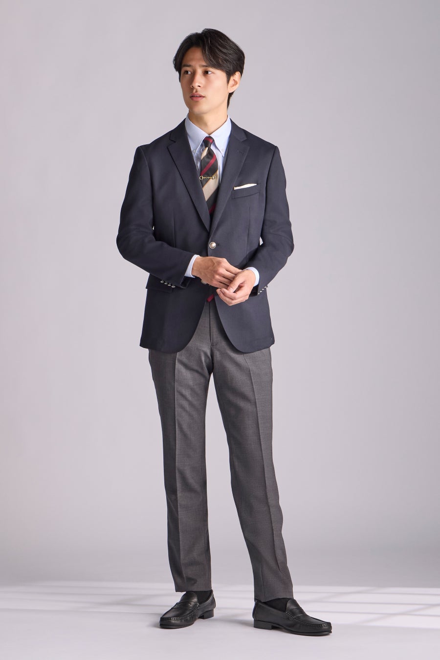 メタルボタンジャケットにグレーパンツを合わせ、レジメンタルタイとタイバーで装いに華やぎを添えたスタイル。デイリーシーンでは、オンブレチェックのシャツで程よくアクセントを効かせ、変化をプラス。着こなし次第で、スタイリングの幅が広がります。