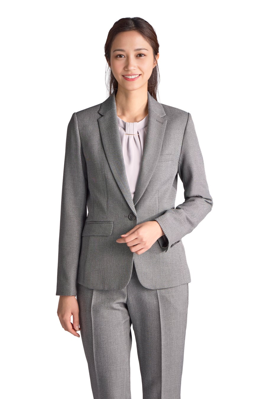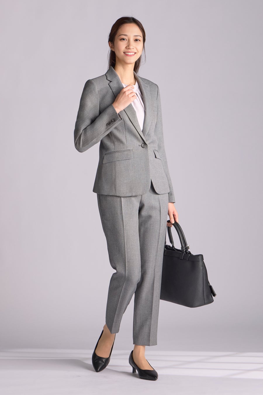ストレッチの効いた素材で動きやすく、長時間の着用も快適。美しく整ったラインと上品なライトグレーが、式典や改まった場にも違和感なく対応します。社内プレゼンからセレモニーまで着回せて、女性らしさもさりげなく感じられるパンツスーツです。
