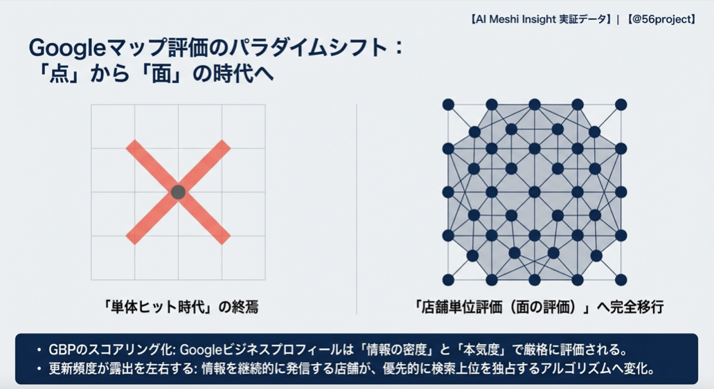 Googleマップを見ているユーザーは、すでに「今日どこで食べるか」を決めようとしている、最も来店確度の高い層です。さらに近年GoogleはGBPの「情報の密度」と「本気度」を厳格に評価するスコアリングへと移行しており、継続的に情報発信する店舗が優先的に検索上位を独占するアルゴリズムへと変化しています。