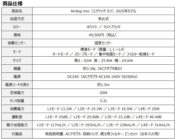 気化式加湿器「Airdog moi(エアドッグ モイ)2025年モデル」販売開始