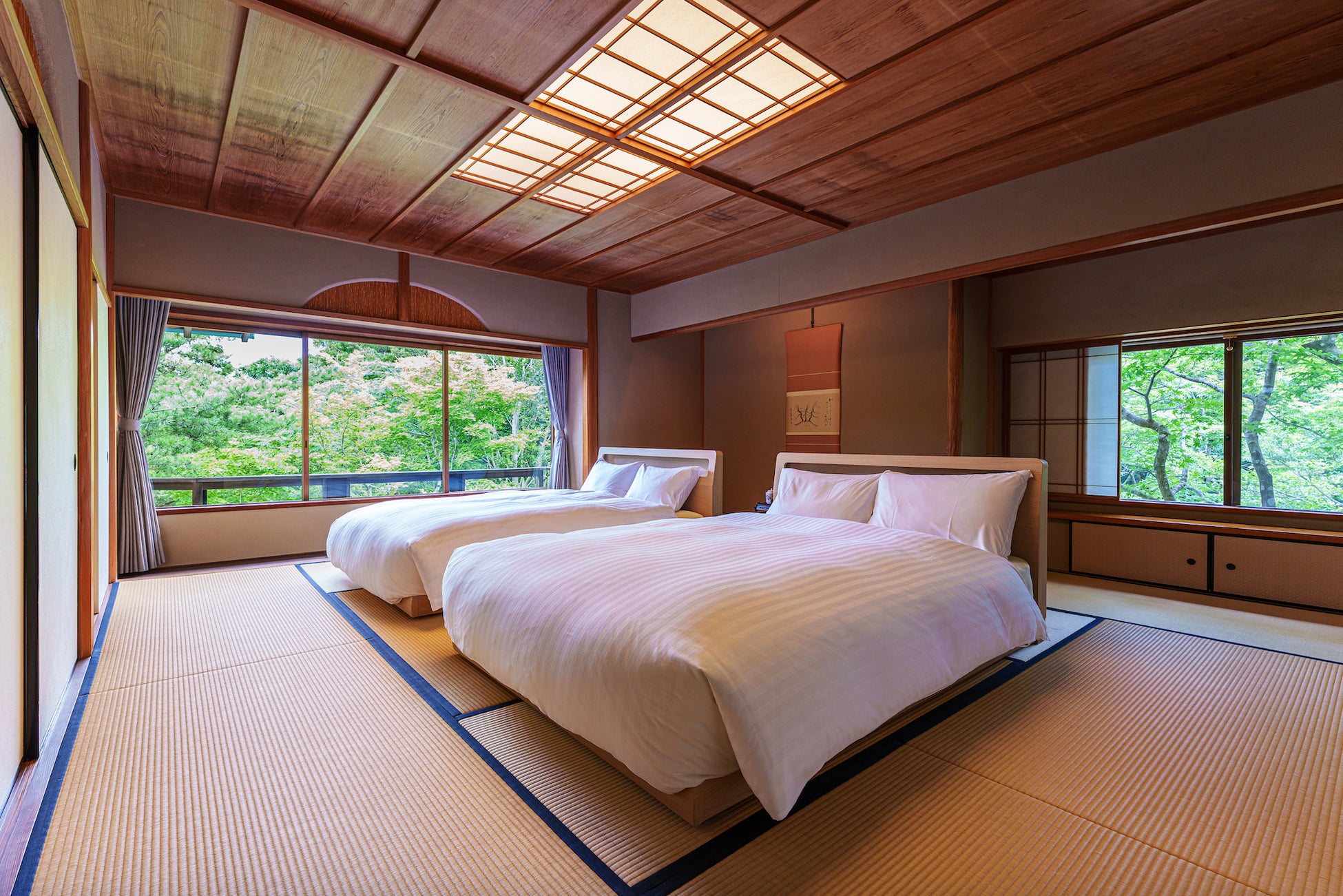 お部屋は、広々とした庭園を臨む二階建て離れの和洋室または和室(庭園ビュー・約250㎡)、そして露天風呂・サウナ付きの特別室(完全独立客室・和洋室・約300㎡)をご用意。どちらのお部屋も、『旅亭 半水盧』ならではの上質な設えと、心安らぐ空間で、非日常の滞在をご提供いたします。