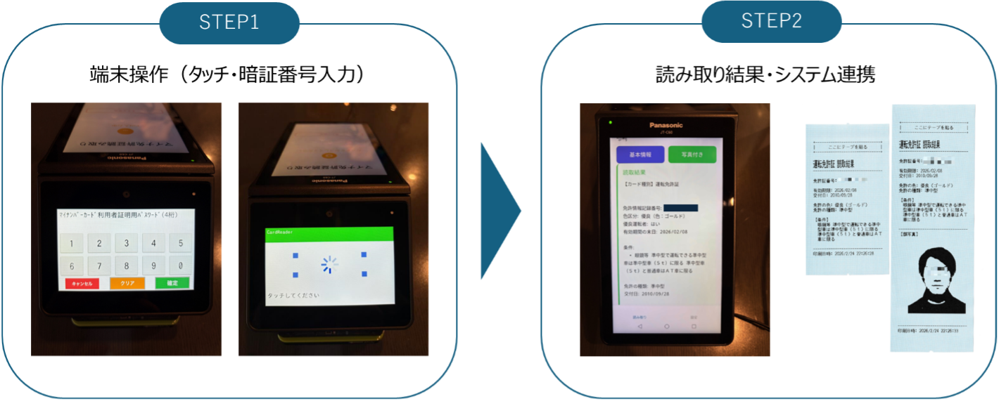 免許証番号、氏名、住所、生年月日、有効期限、免許の種類・条件、顔写真データをICチップから直接取得※4し、事業者の基幹システムへリアルタイムに連携します。契約書やレンタル台帳への自動反映により、手入力作業を原則不要とし、転記ミスを防止します。また、読み取り結果はレシート紙への書き出しにも対応しており、紙の控えが必要な現場運用にも柔軟に対応します。