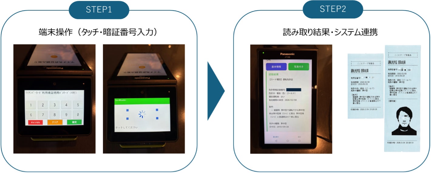 従来約2分※2かかっていたマイナ免許証による店頭での本人確認を、最短約10秒※2に短縮します。「マイナ免許証を端末にタッチする」「暗証番号(4桁)を入力する」の2ステップのみで完了し、繁忙期の行列解消や顧客体験の向上に貢献します。