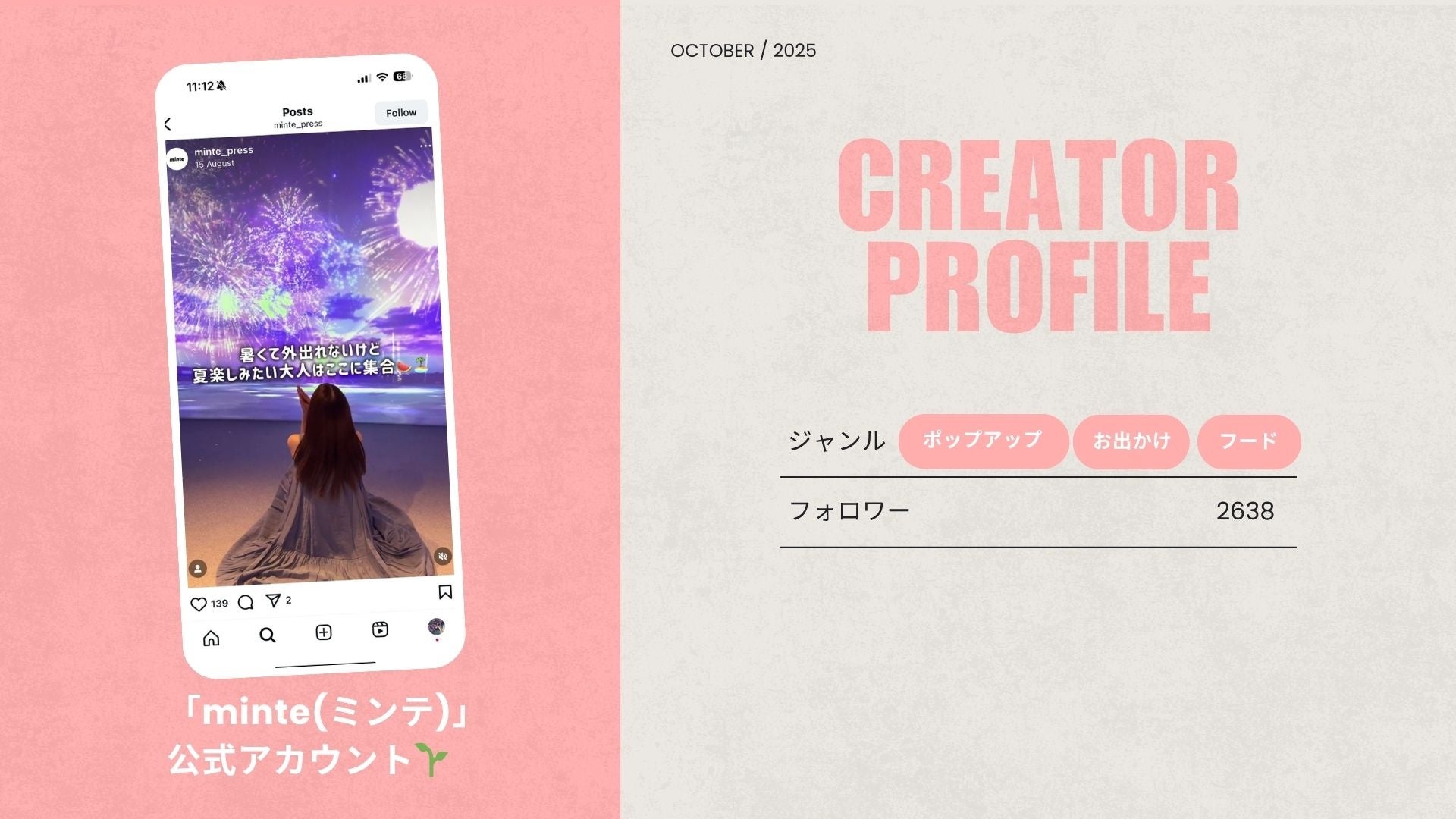 「minte(ミンテ)」公式アカウント🌱は、企業やブランドのポップアップイベントをはじめ、話題のスイーツやドリンクなどを中心に取材し、動画を制作・発信しています。これまでの投稿の中には、再生回数70万回を超える動画も。ポップアップ・おでかけ・フード分野に強みを持つ同メディアの加盟により、SNS上でのイベント認知や集客の効果がさらに期待できます。