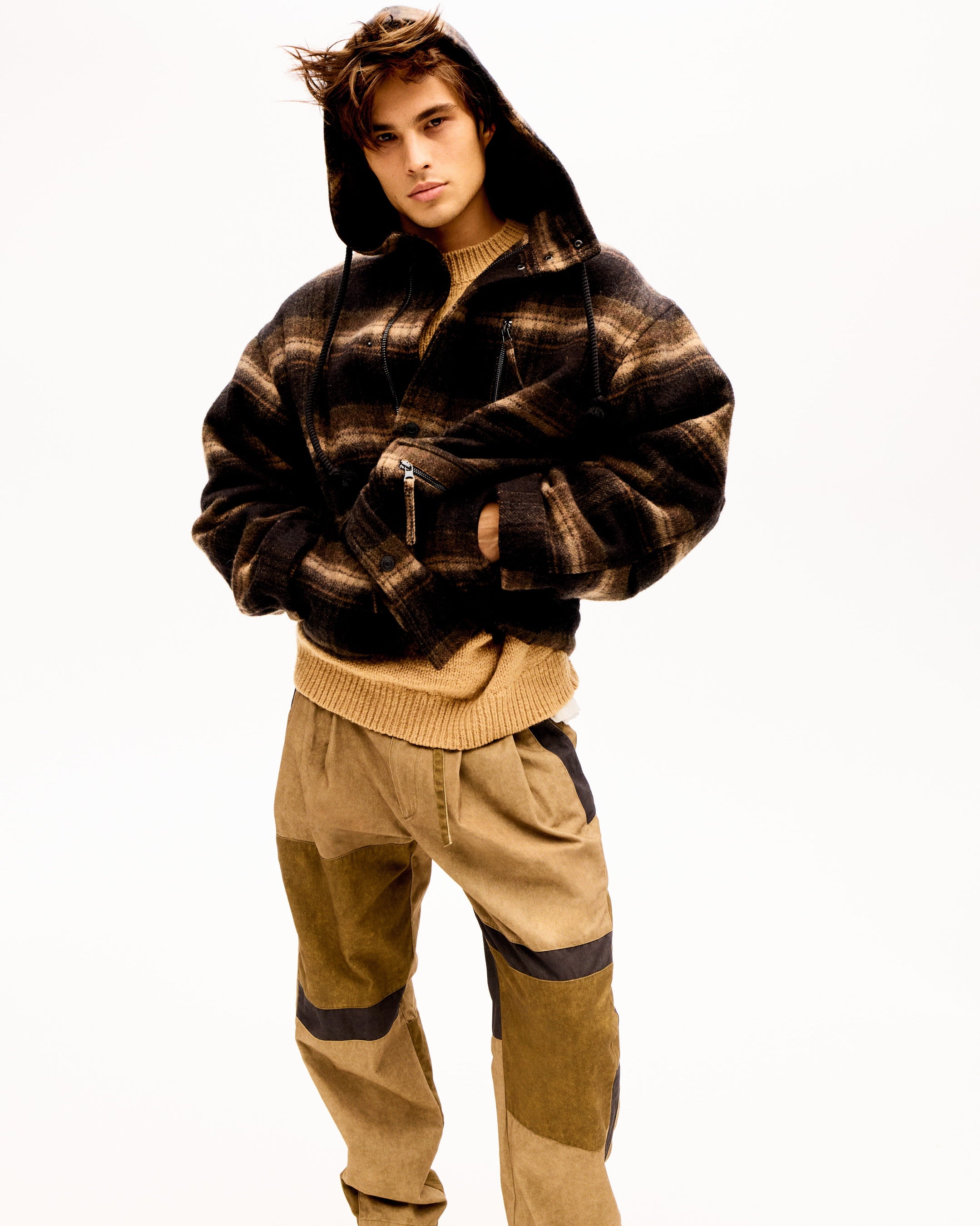 袖を無造作にロールアップし、プリーツパンツにタックインしたシャンブレーシャツ、素肌に直接纏うケーブルニット、完璧なフィット感のクルーネックTシャツなど、随所に気負いのない官能性が宿ります。プレイド柄やチェックのポプリン、ウォッシュドスウェットが、控えめでカレッジライクなリラックス感をもたらします。