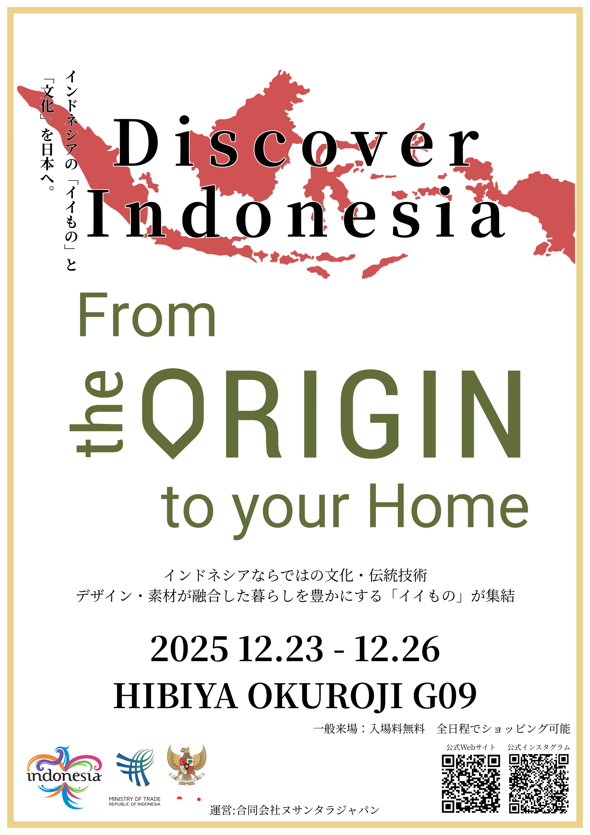 合同会社ヌサンタラジャパン(本社:神奈川県、代表:阿部 安紀子)は、駐日インドネシア共和国大使館とのコラボレーションイベント Made In Indonesiaの商談会「Discover Indonesia From the ORIGIN to your home」を2025年12月23日(火)〜26日(金)の4日間、日比谷OKUROJIにて開催いたします。