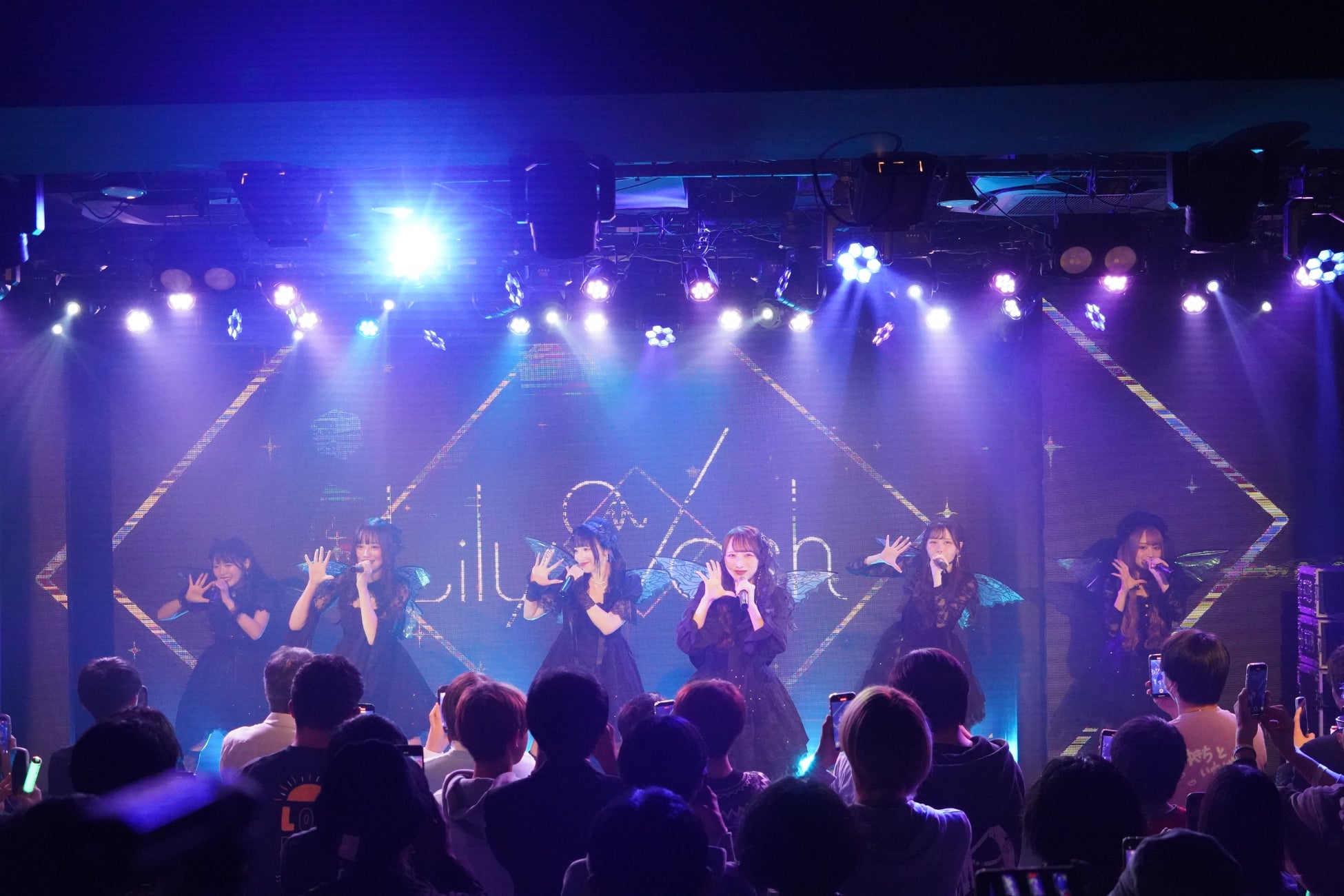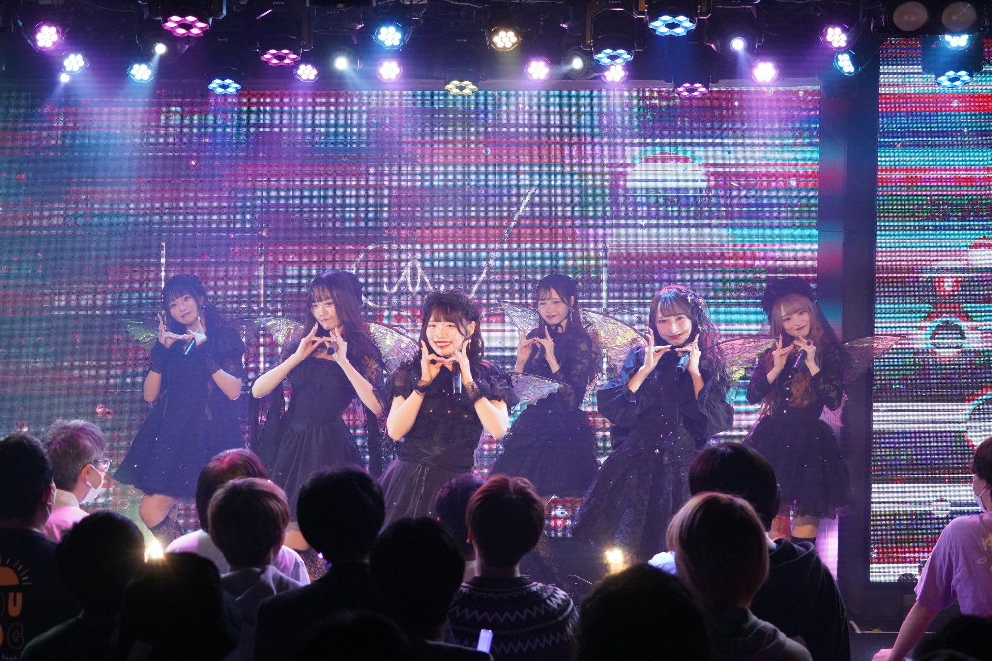 その後のMCでは、今回の「ブラックフェアリー」ビジュアルでアクスタなどの新グッズが発売されること、また今年9月に加入した青葉ゆき奈、大越せらの推しTシャツが発売されることが発表。さらに、11月22日(土)に行われる次回の定期公演(会場:恵比寿CreAto)にて、新曲を披露することがサプライズで告知されました。