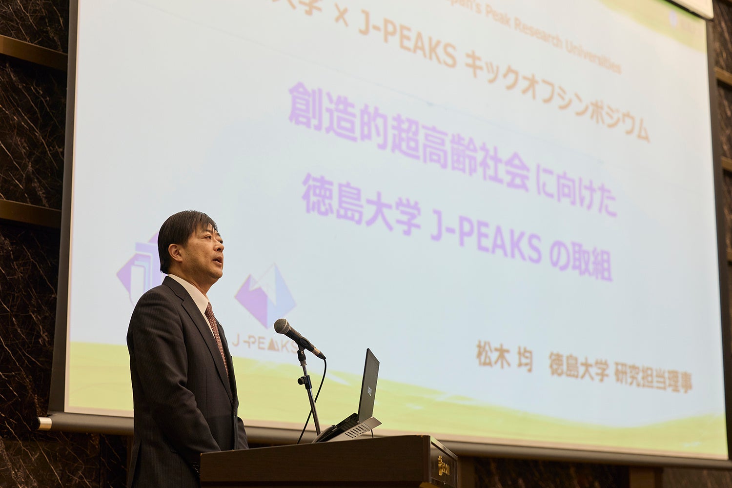 続いて、松木均理事・副学長(研究担当)より「創造的超高齢社会に向けた徳島大学J-PEAKSの取組み」と題して説明がありました。河村学長の挨拶及び指針表明を受け、「社会指向性の先端的研究」と「地域指向性の共創的連携」という2つの軸のもと、本学の強みである4つのイニシアティブを核とした研究推進の枠組みと、その成果を社会実装や人材育成へと循環させる構想が示されました。