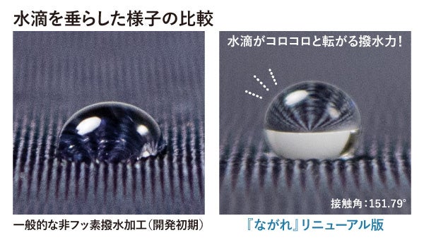 新しい『ながれ』は、フッ素を使わずに高い撥水性能を実現した新しい撥水仕様です。これまでと変わらず「水をはじく」使い心地はそのままに、環境にも人にもやさしい素材づくりへと進化しました。