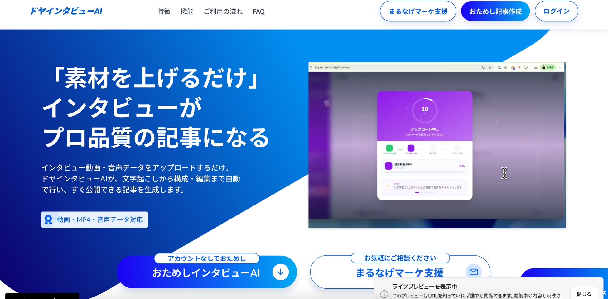 インタビュー動画(MP4)や音声ファイルをアップロードするだけ。