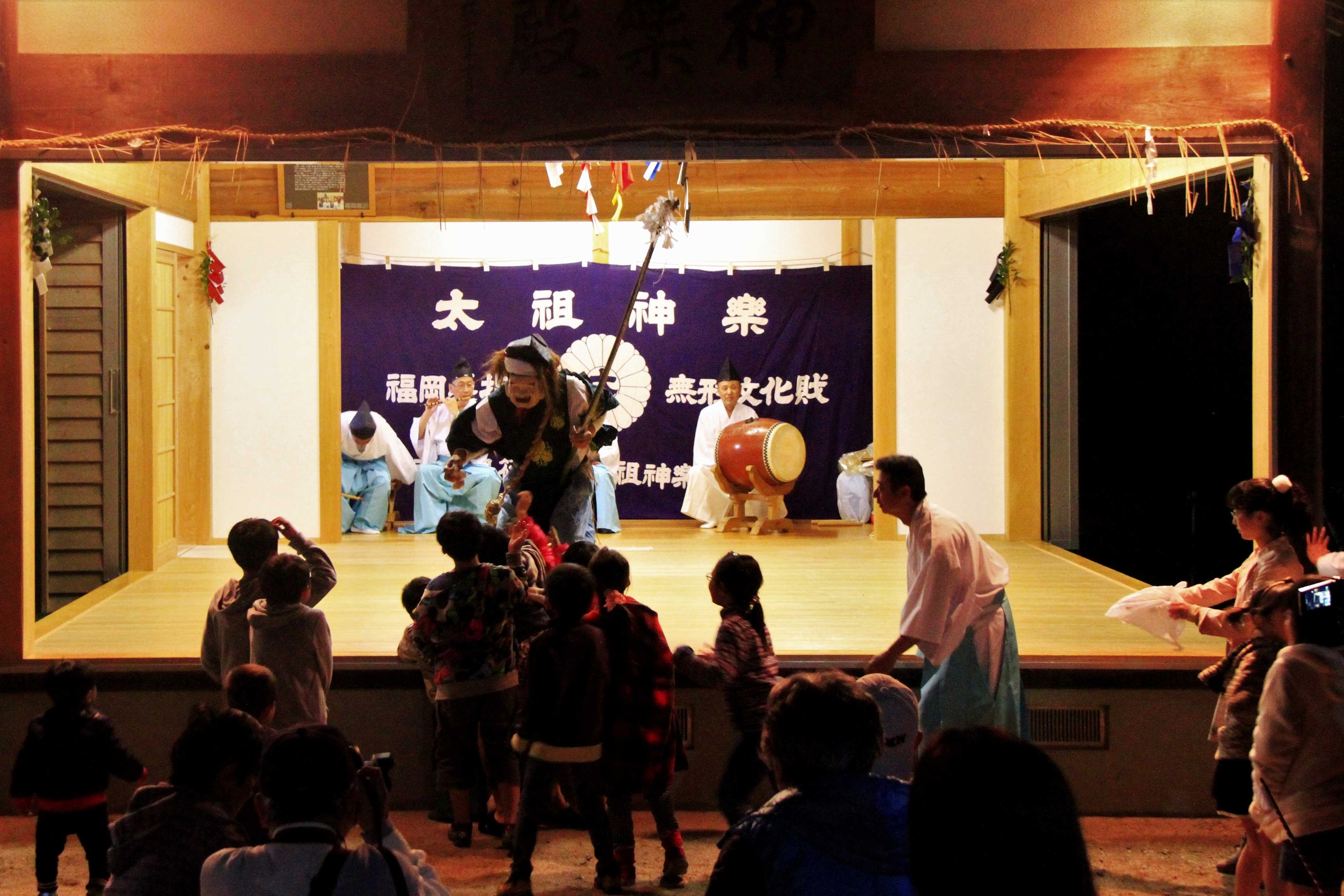 春と秋の祭礼では、江戸時代から受け継がれてきた伝統芸能「太祖神楽」(福岡県指定無形民俗文化財)が奉納されます。太祖神楽は、五穀豊穣や無病息災を願う神事として伝承され、世代を越えて技と心が受け継がれてきました。現在も祭りのたびに、地域の人の手によって大切に舞い継がれています。
