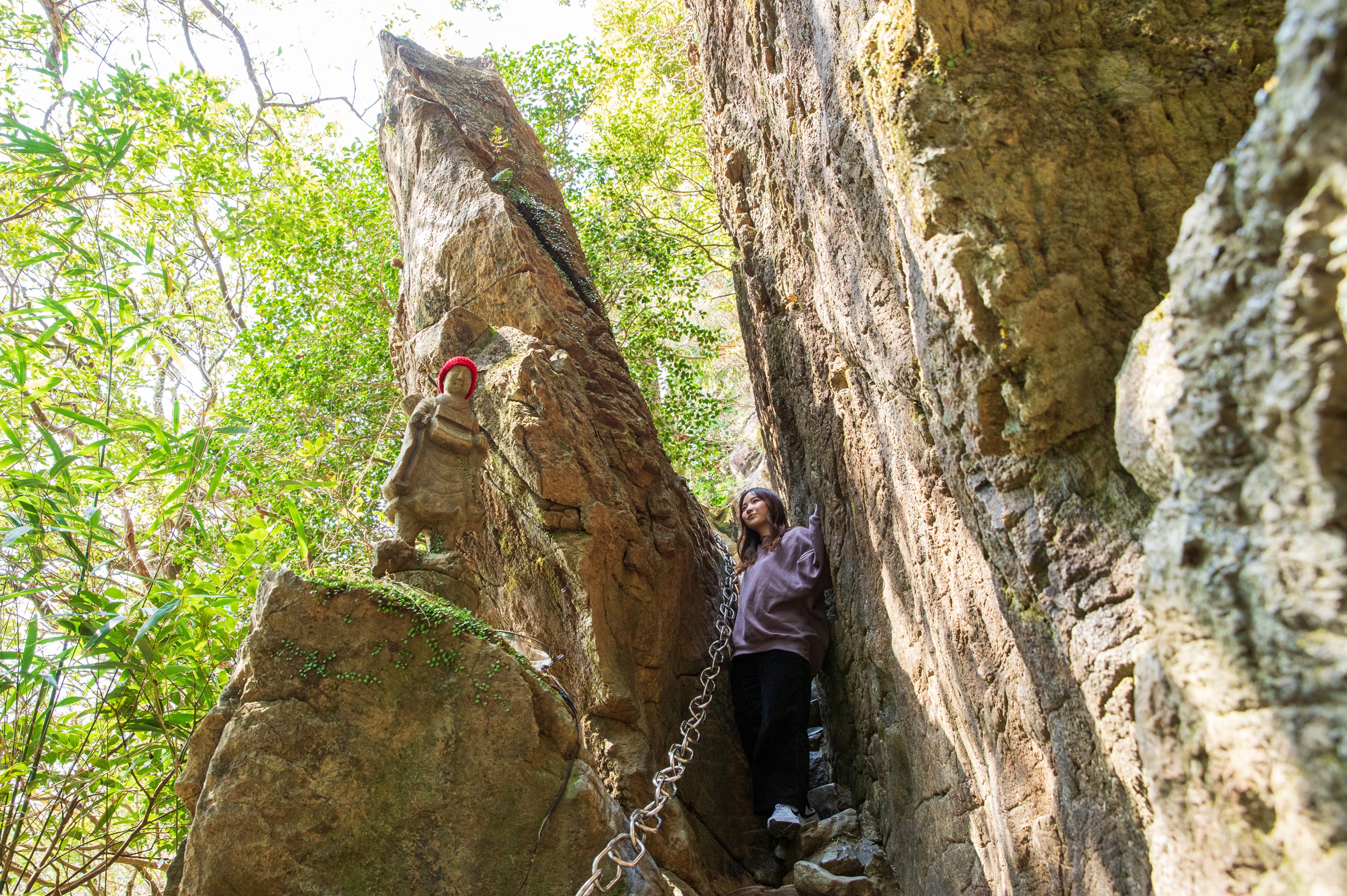 「善人にしか通れない」「悪人は挟まれる」という言い伝えがあり、古くから修行者の心を見極める場所として崇められてきました。自然の造形と信仰が一体となった、心地よい緊張感と神秘を体験できる場所です。
