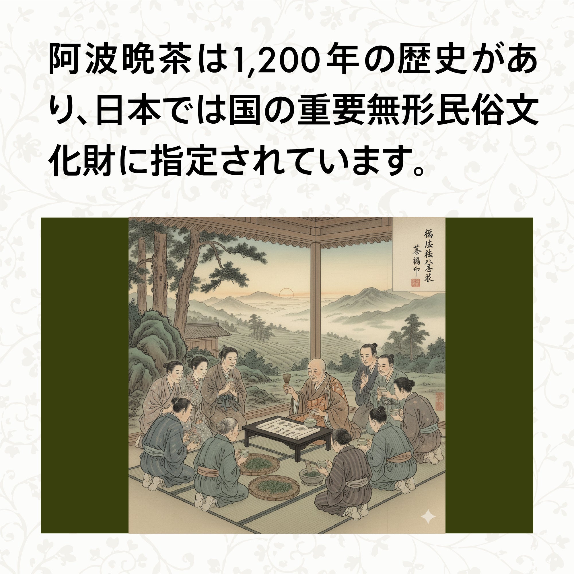 お茶を乳酸菌で発酵させる独特の製法で、酸味のある独特な風味と、カフェイン含有量が少ないという特性から、赤ちゃんや病人でも飲みやすいお茶として徳島県民の食生活に深く浸透しました。熱々の阿波晩茶をかけた「茶漬け」は日常食として親しまれ、お盆には「お茶湯」として仏様に捧げられるなど、日々の暮らしと地域の儀礼文化に深く関わってきました。2021年には、その製造技術は茶の分野で日本初となる国の重要無形民俗文化財に指定されました。※2