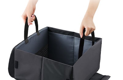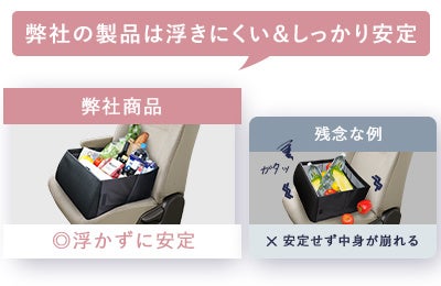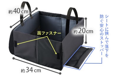 走行中のカーブや急ブレーキでも荷物が転がらない安心設計。助手席や後部座席での荷物の転落を防ぎ、安心して運転に集中できます。サイズは収納時で縦20cm×横34cm×奥行40cm。