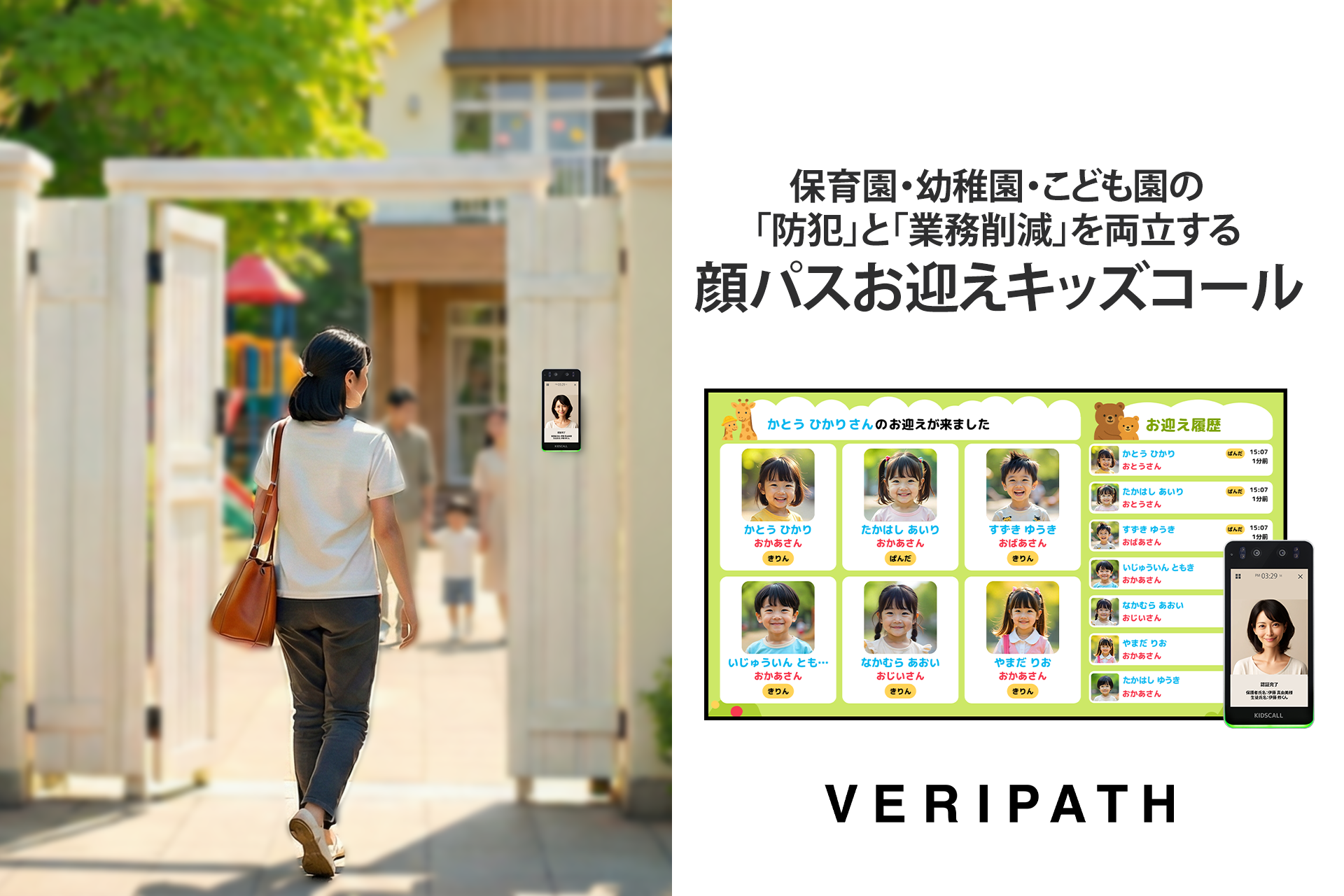 株式会社VERIPATH(本社:兵庫県神戸市、代表取締役:山岡 源)は、2026年2月1日より、保育園・幼稚園・こども園の顔認証お迎えシステム「KIDSCALL(キッズコール)」の全国へ本格展開を開始いたします。