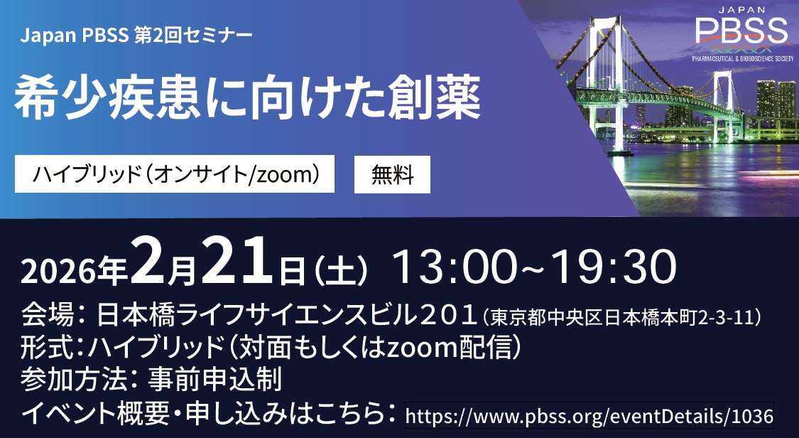 一般社団法人 Japan Pharmaceutical & BioScience Society(Japan PBSS)は、2026年2月21日(土)に開催予定のイベント「希少疾患に向けた創薬」について、追加情報をお知らせいたします。