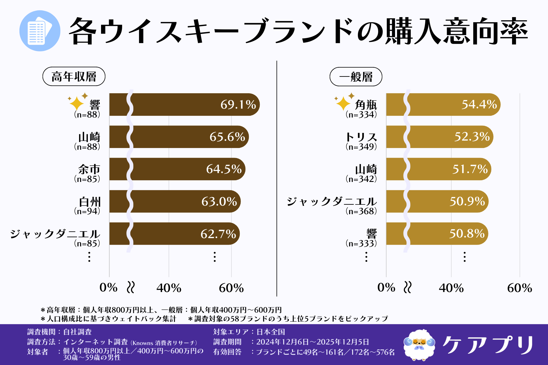高年収層/一般層の男性を対象にウイスキーブランドの人気を比較!「高級志向」だけではない「気取らない」素顔に迫る。