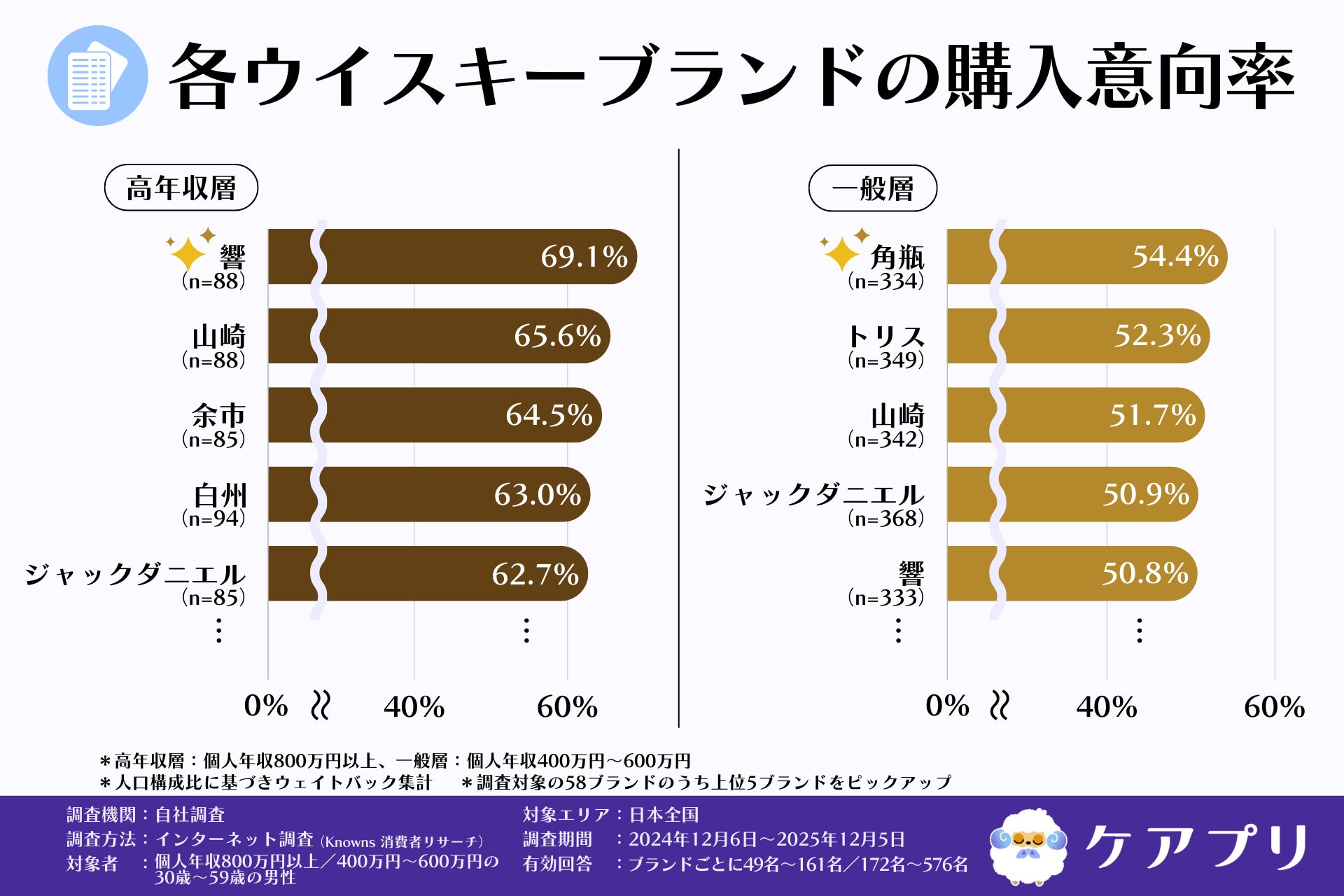 高年収層における購入意向は『響』(69.1%)が最も高く、次いで『山崎』(65.6%)、『余市』(64.5%)、『白州』(63.0%)、『ジャックダニエル』(62.7%)と、いずれも6割を超える高い数値となりました。一方、一般層では『角瓶』(54.4%)が最も高く、続いて『トリス』(52.3%)、『山崎』(51.7%)という結果になりました。