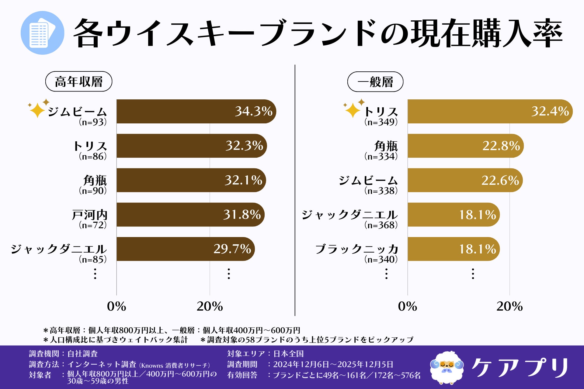 高年収層において現在購入率が最も高かったのは『ジムビーム』(34.3%)で、次いで『トリス』(32.3%)、『角瓶』(32.1%)と続きました。一方、一般層においては『トリス』(32.4%)が最も高く、続いて『角瓶』(22.8%)、『ジムビーム』(22.6%)が高い数値を示しました。
