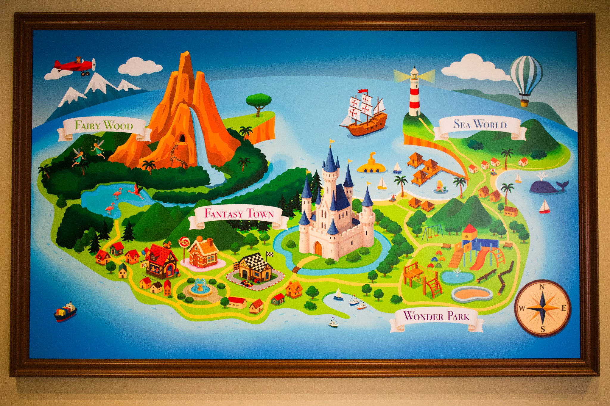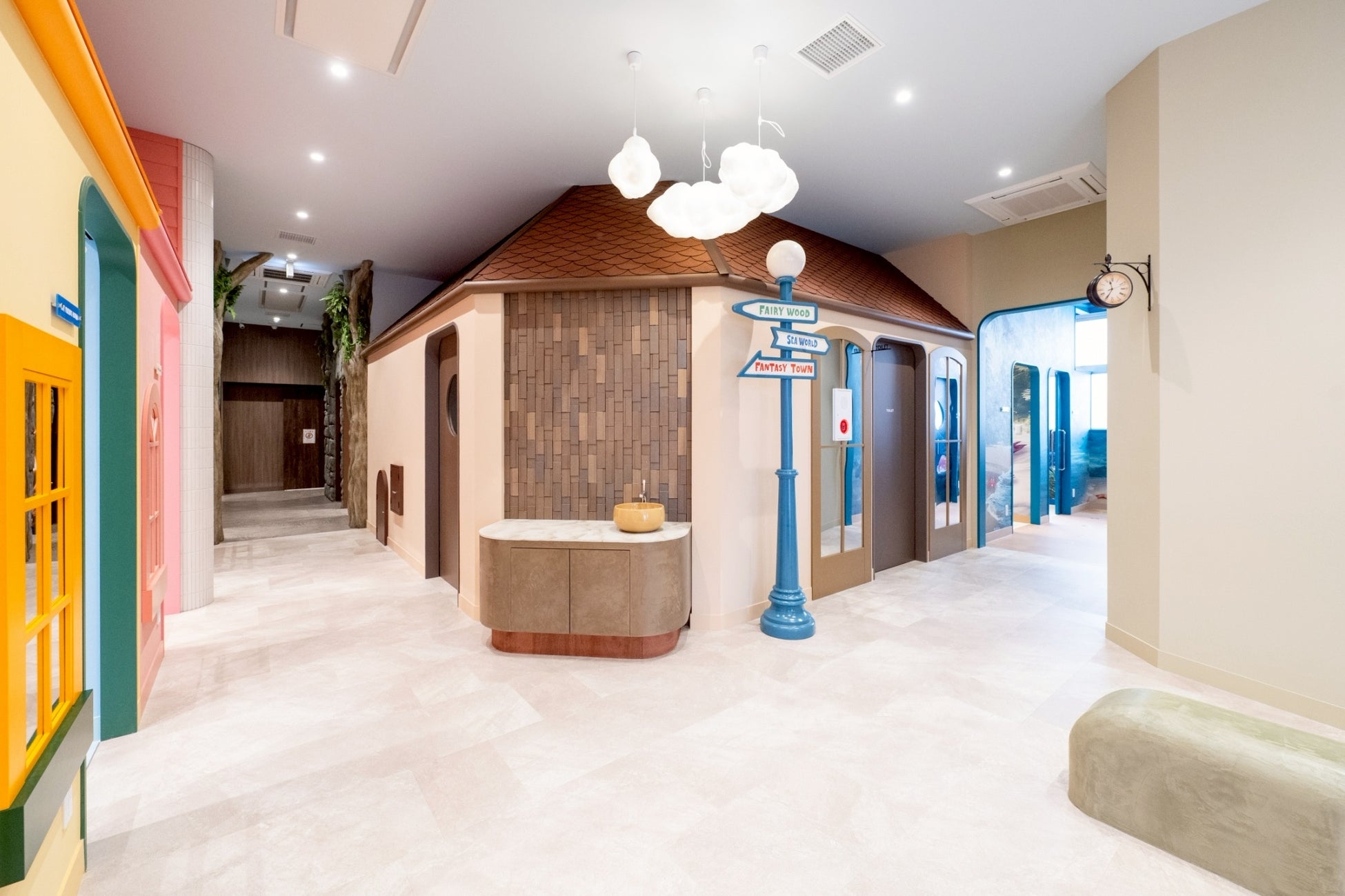 クリニックエリアは「FANTASY TOWN(お城やお菓子のお部屋)」「FAIRY WOOD(妖精が住む森)」「SEA WORLD(宝島のある海の世界)」という3つのエリアで構成され、それぞれに計9つの個室診察室を設置しています。