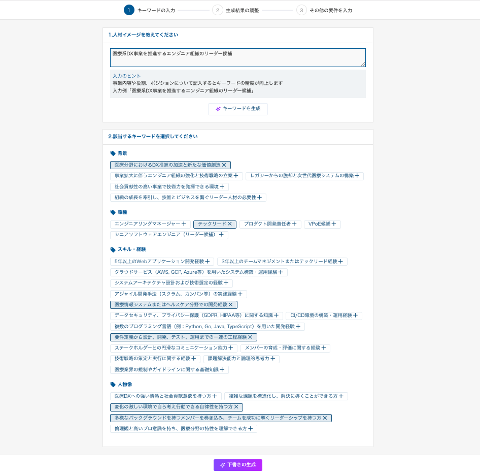 採用したい人物のイメージを簡単な言葉(「医療系DX事業を推進するエンジニア組織のリーダー候補」など)で入力すると、AIがそれに合った職種や必要なスキルのキーワードを提案します。その中から求人に合うものを選択するだけで、採用背景から業務内容、求める人物像までを網羅した、魅力的な求人が自動で生成されます。専門知識が必要な難度の高い求人でも、文章をゼロから考える手間を省き、求人をスピーディーに作成できます。