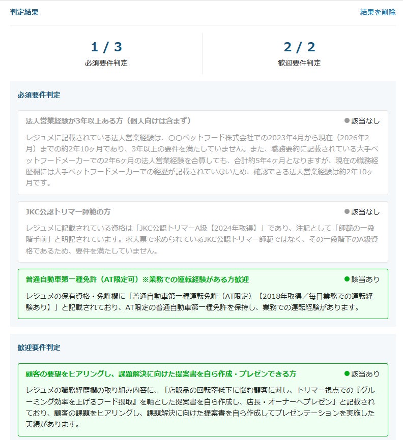 応募者から提出された履歴書や職務経歴書などの書類をAIが読み込み、求人要件にどの程度合致しているかを自動で解析・判定する機能です。事前に「必須要件」や「歓迎要件」(「法人営業経験が3年以上」といった具体的な条件を最大10件)を登録しておくだけで、AIが書類と要件のマッチ度を提示します。大量の書類を1件ずつ目視で確認する負担を軽減し、スピーディーで精度の高い書類選考をサポートします。