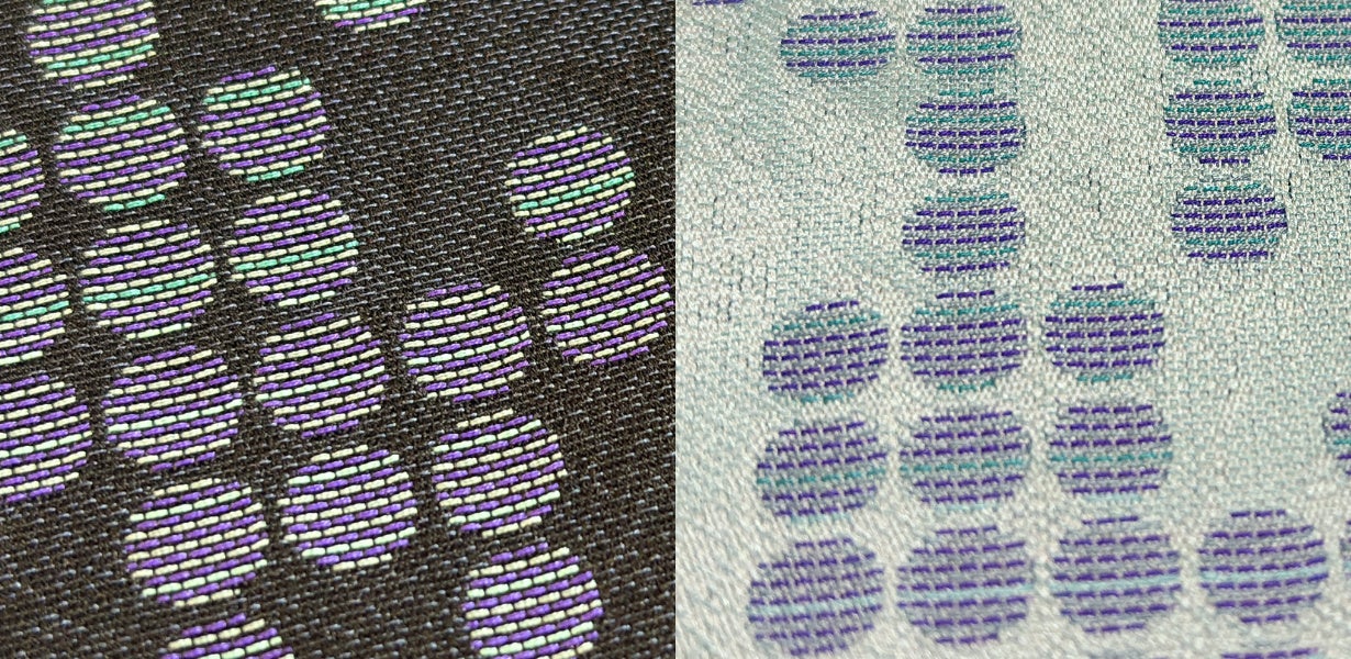 通常、西陣織は画像やプリントによるものですが、西陣織で表現するにはたて糸とよこ糸のみで構成するため曲線部分に大変苦労しました。なおかつ織でグラデーションをいれております。開発に当たってはQRコードの開発元であるデンソーウェーブ様とミーティングをさせて頂き、このものづくりに賛同してもらうことができました。素材には高級着物の素材であるシルクを100%使用しております。絹織物ならではの光沢と織の上品さがあります。